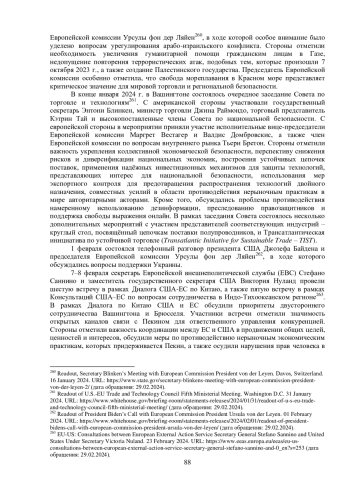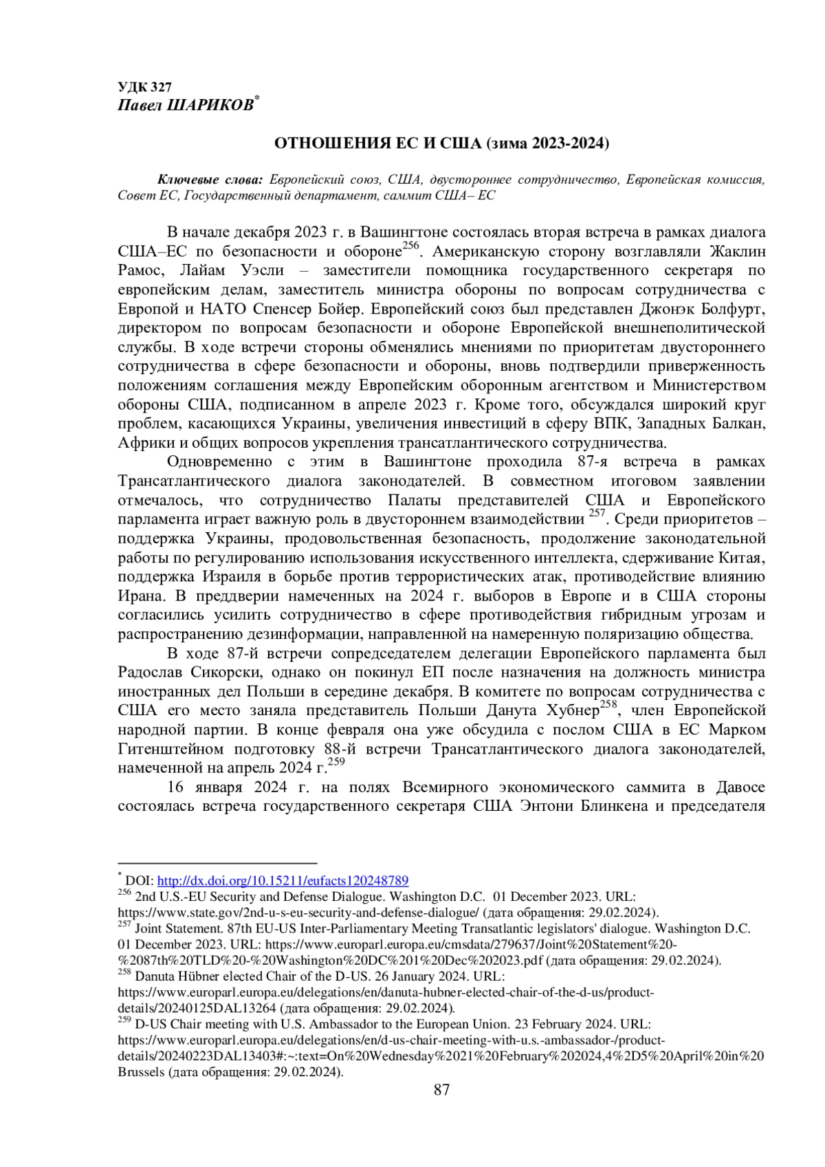 Одновременно с этим в Вашингтоне проходила 87-я встреча в рамках Трансатлантического диалога законодателей. В совместном итоговом заявлении отмечалось, что сотрудничество Палаты представителей США и Европейского парламента играет важную роль в двустороннем взаимодействии 257. Среди приоритетов – поддержка Украины, продовольственная безопасность, продолжение законодательной работы по регулированию использования искусственного интеллекта, сдерживание Китая, поддержка Израиля в борьбе против террористических атак, противодействие влиянию Ирана. В преддверии намеченных на 2024 г. выборов в Европе и в США стороны согласились усилить сотрудничество в сфере противодействия гибридным угрозам и распространению дезинформации, направленной на намеренную поляризацию общества