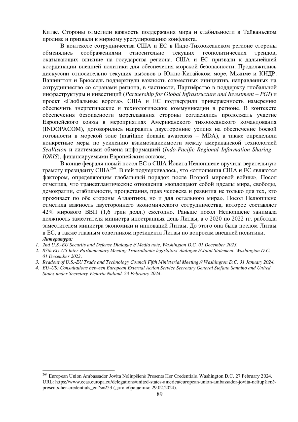 В начале декабря 2023 г. в Вашингтоне состоялась вторая встреча в рамках диалога США–ЕС по безопасности и обороне256. Американскую сторону возглавляли Жаклин Рамос, Лайам Уэсли – заместители помощника государственного секретаря по европейским делам, заместитель министра обороны по вопросам сотрудничества с Европой и НАТО Спенсер Бойер. Европейский союз был представлен Джонэк Болфурт, директором по вопросам безопасности и обороне Европейской внешнеполитической службы. В ходе встречи стороны обменялись мнениями по приоритетам двустороннего сотрудничества в сфере безопасности и обороны, вновь подтвердили приверженность положениям соглашения между Европейским оборонным агентством и Министерством обороны США, подписанном в апреле 2023 г. Кроме того, обсуждался широкий круг проблем, касающихся Украины, увеличения инвестиций в сферу ВПК, Западных Балкан, Африки и общих вопросов укрепления трансатлантического сотрудничества