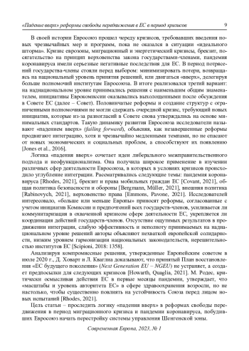 9. Jones E., Kelemen R.D., Meunier S. (2021) Failing forward? Crises and patterns of European integration. Journal of European Public Policy. Vol. 28. No. 10. P. 1519-1536. DOI: 10.1080/13501763.2021.1954068 EDN: OGVYBT