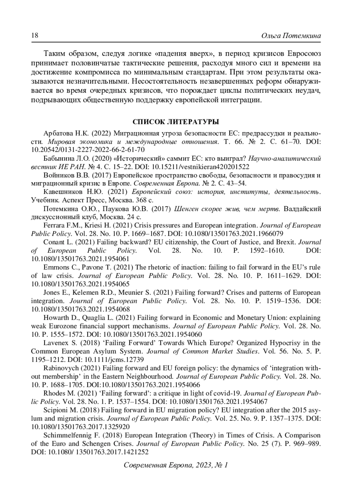 13. Rhodes M. (2021) ‘Failing forward’: a critique in light of covid-19. Journal of European Public Policy. Vol. 28. No. 1. P. 1537-1554. DOI: 10.1080/13501763.2021.1954067 EDN: MNKTUL