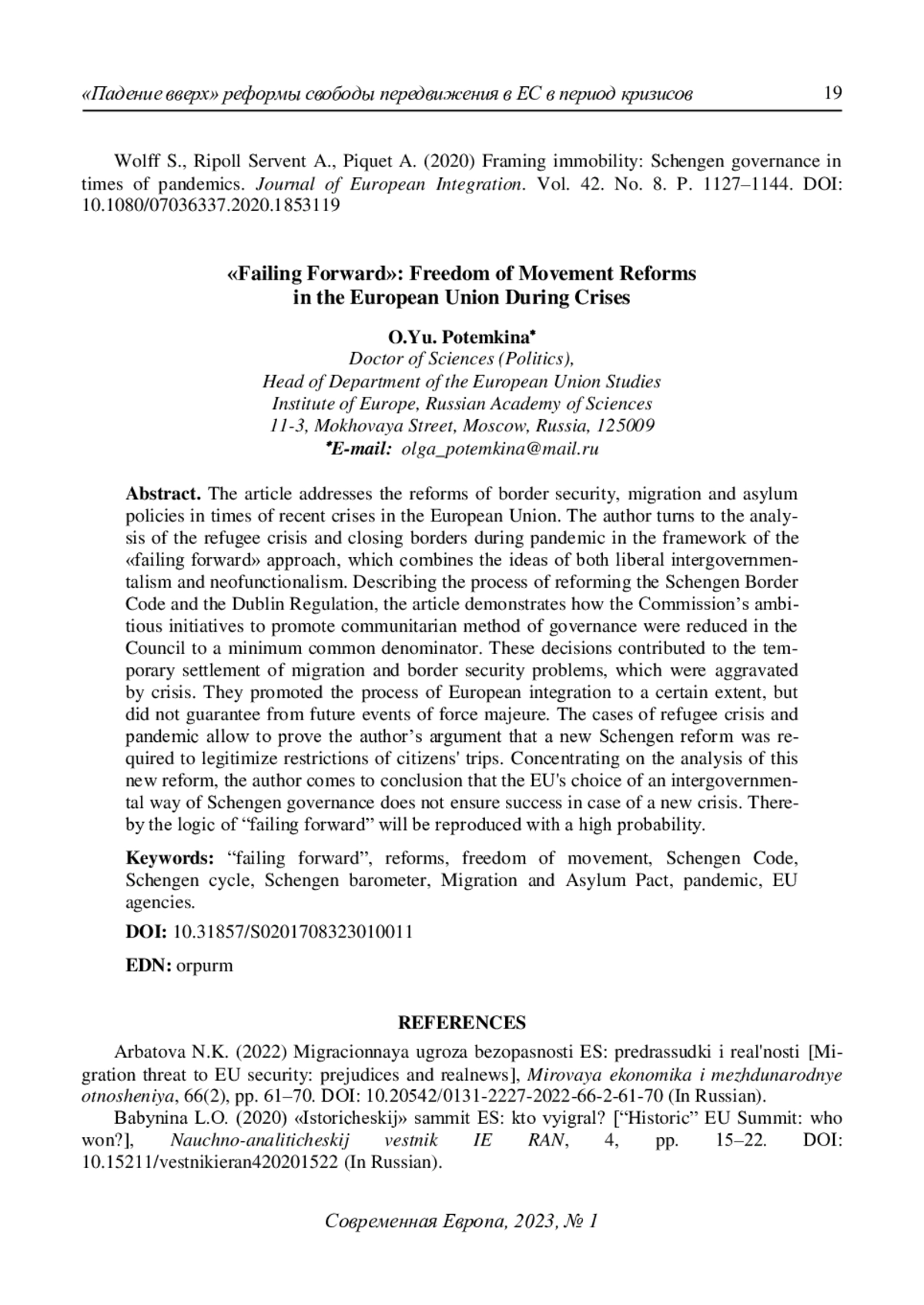 16. Wolff S., Ripoll Servent A., Piquet A. (2020) Framing immobility: Schengen governance in times of pandemics. Journal of European Integration. Vol. 42. No. 8. P. 1127-1144. DOI: 10.1080/07036337.2020.1853119 EDN: DMYUGC