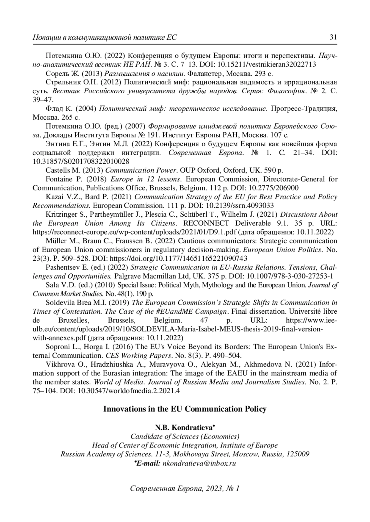 5. Потемкина О.Ю. (2022) Конференция о будущем Европы: итоги и перспективы. Научно-аналитический вестник ИЕ РАН. №3. С. 7-13. DOI: 10.15211/vestnikieran32022713 EDN: BGRBWB