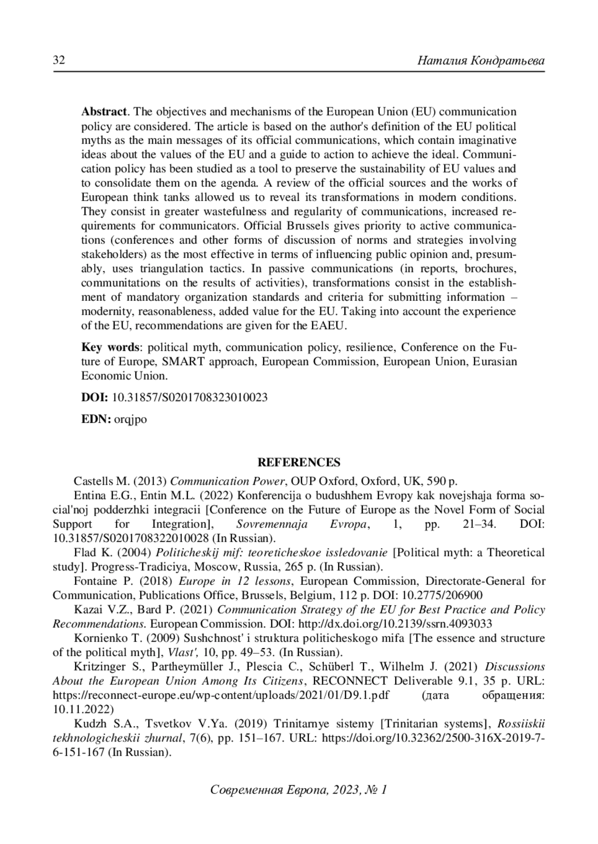 13. Kazai V.Z., Bard P. (2021) Communication Strategy of the EU for Best Practice and Policy Recommendations. European Commission. 111 p. DOI: 10.2139/ssrn.4093033