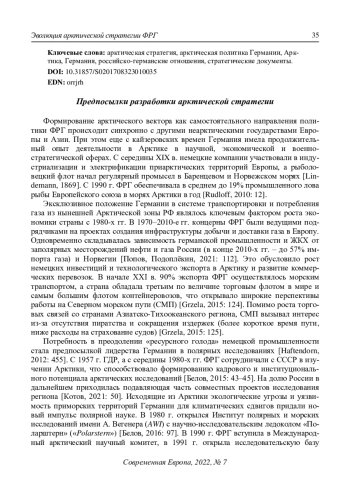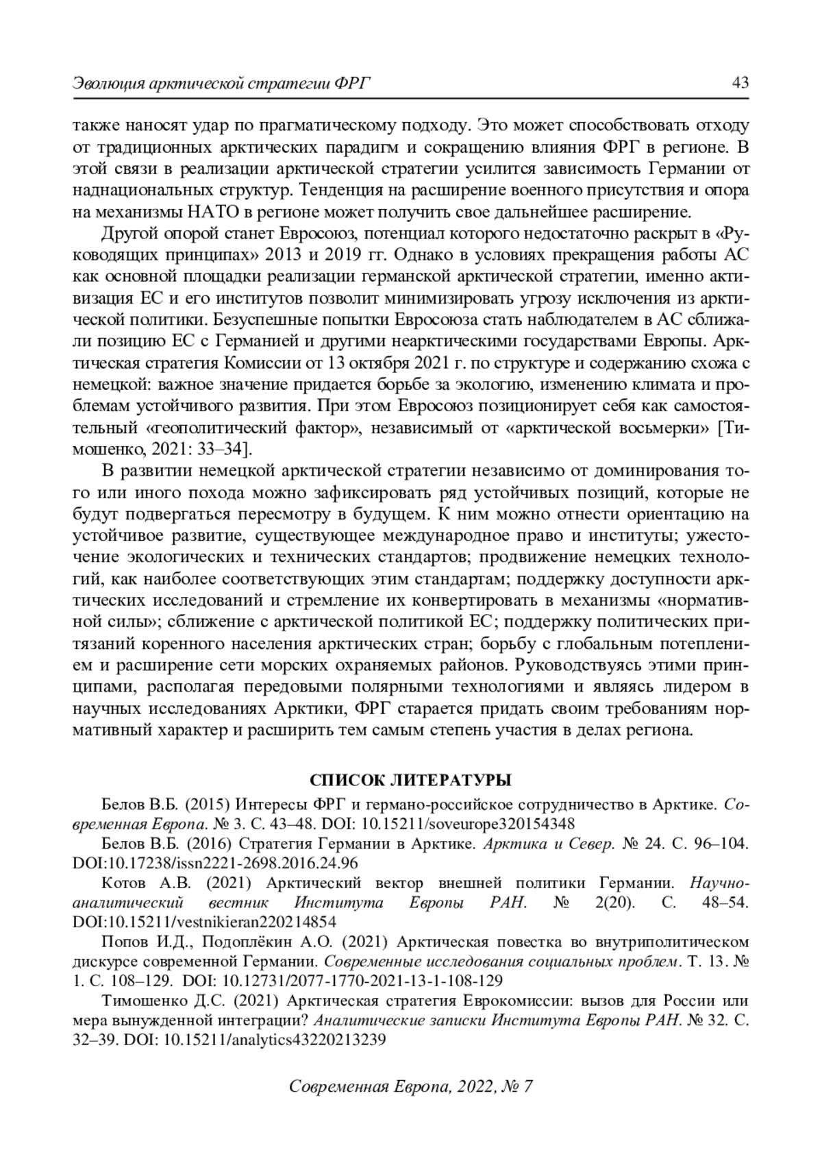 1. Белов В.Б. (2015) Интересы ФРГ и германо-российское сотрудничество в Арктике. Современная Европа. № 3. С. 43-48. DOI: 10.15211/soveurope320154348 EDN: UDWFQD