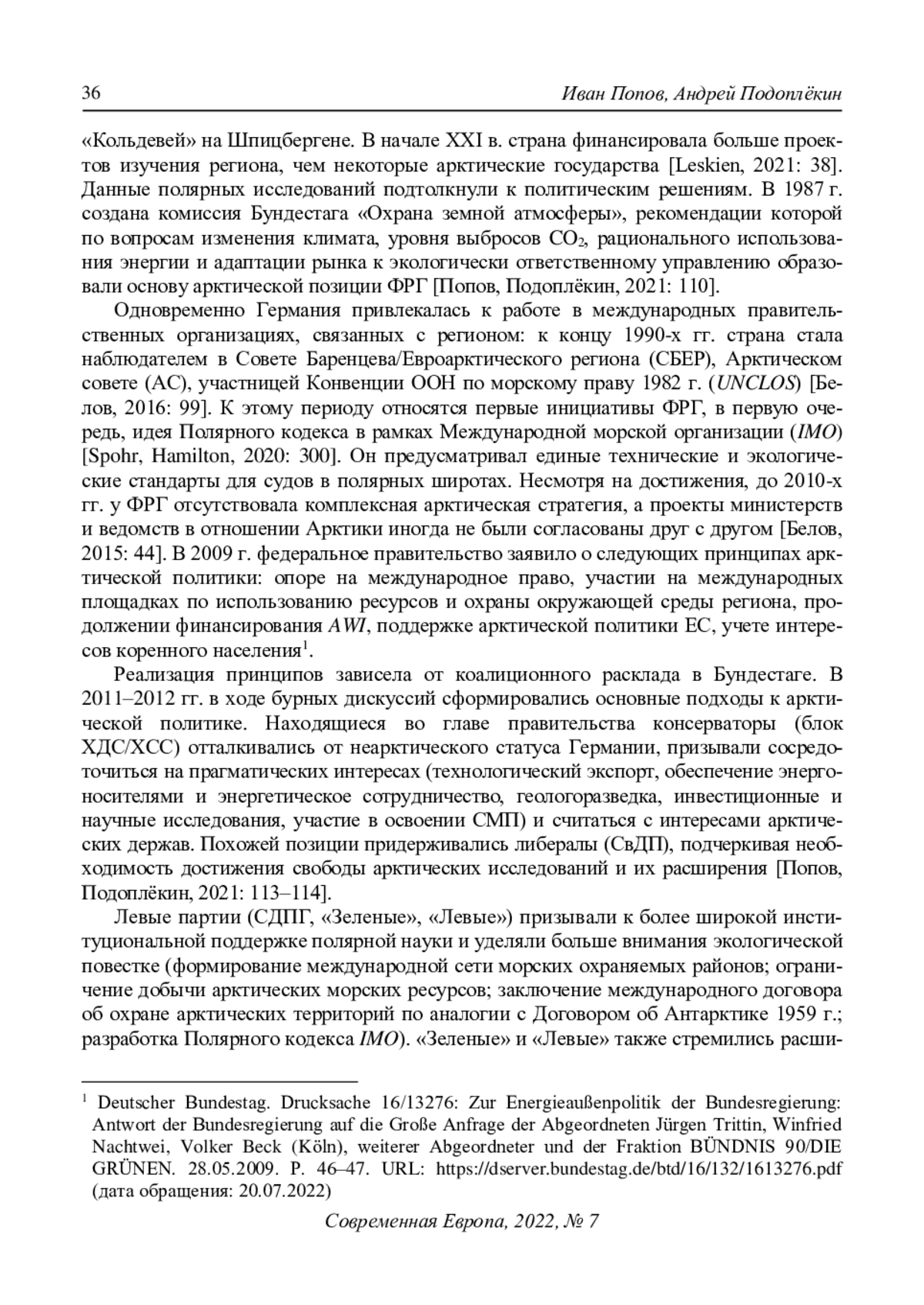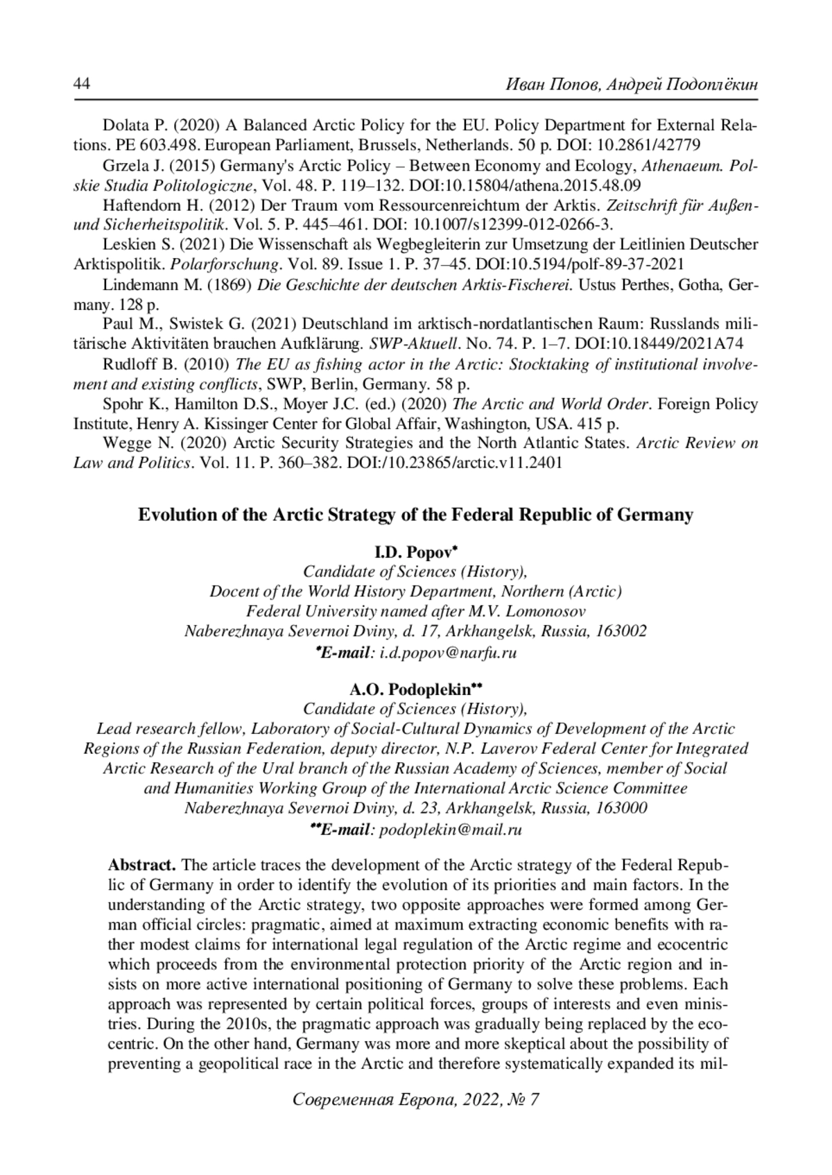 4. Попов И.Д., Подоплёкин А.О. (2021) Арктическая повестка во внутриполитическом дискурсе современной Германии. Современные исследования социальных проблем. Т. 13. № 1. С. 108-129. DOI: 10.12731/2077-1770-2021-13-1-108-129 EDN: DZPOCQ