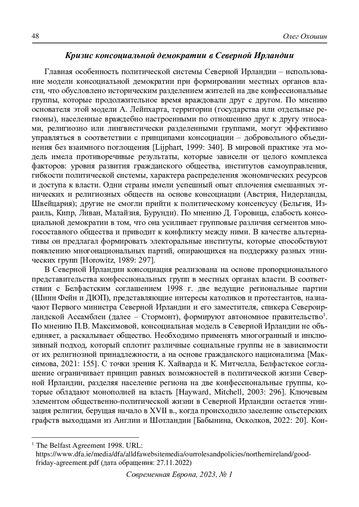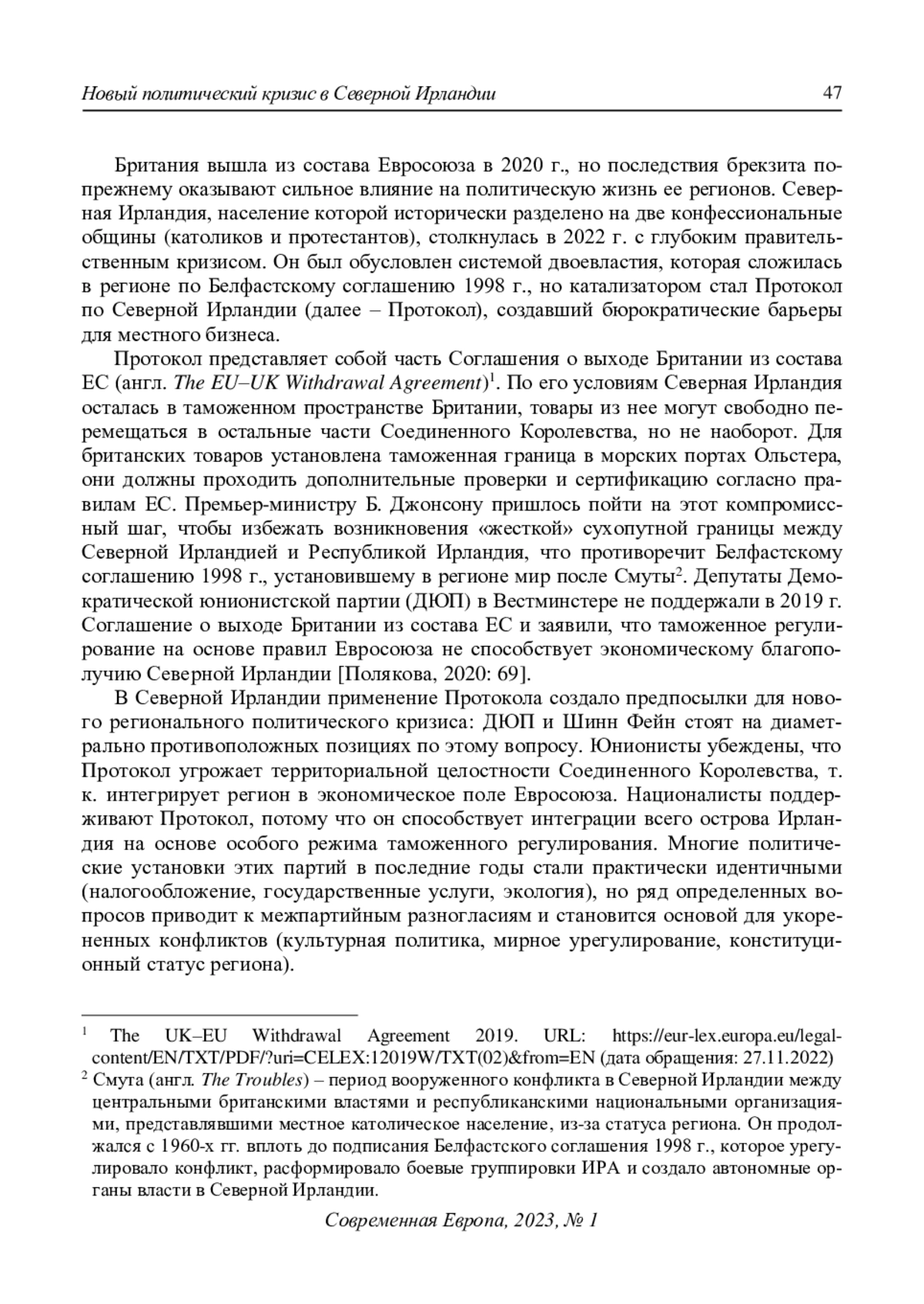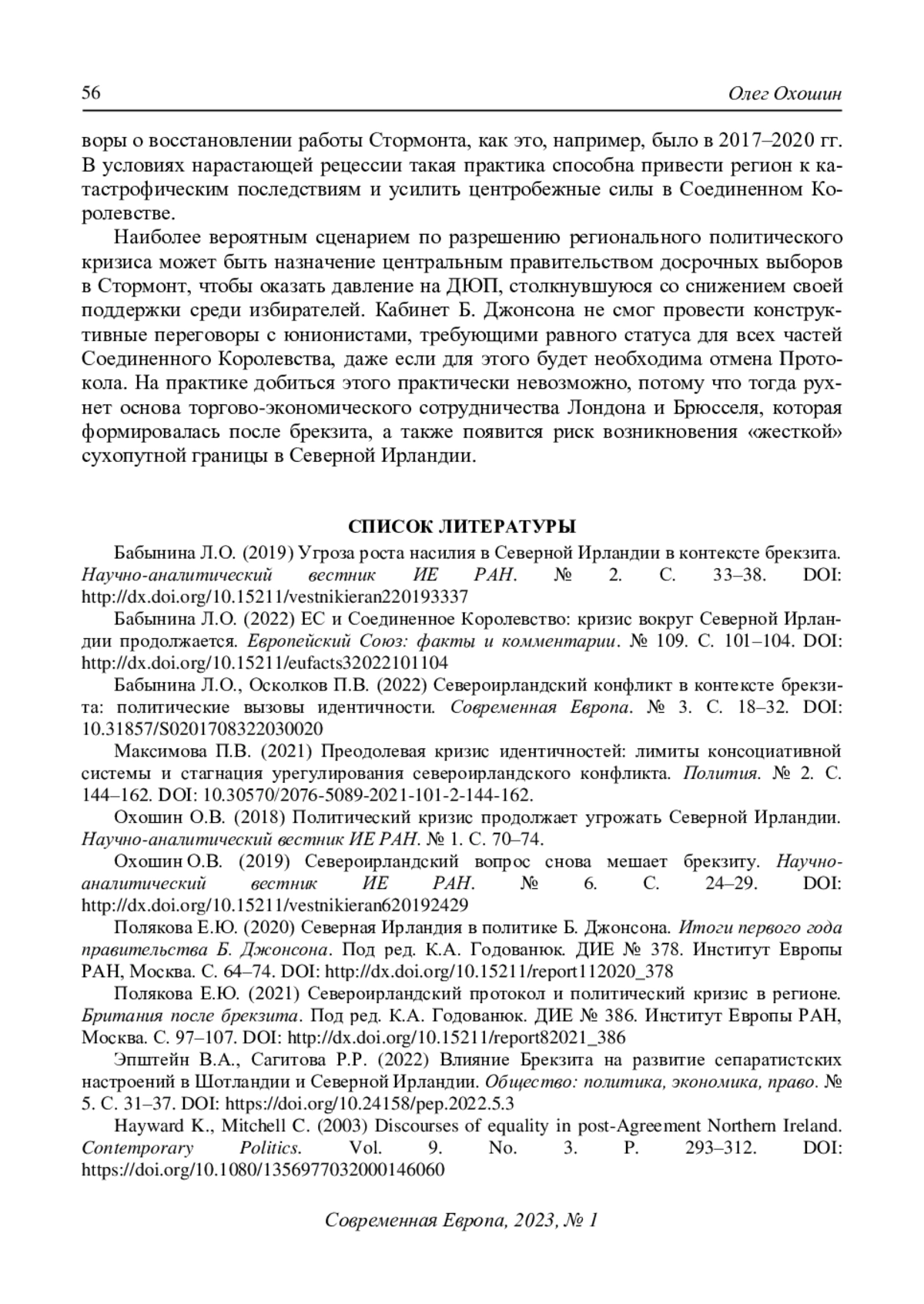 3. Бабынина Л.О., Осколков П.В. (2022) Североирландский конфликт в контексте брекзита: политические вызовы идентичности. Современная Европа. № 3. С. 18-32. DOI: 10.31857/S0201708322030020 EDN: GERQGA