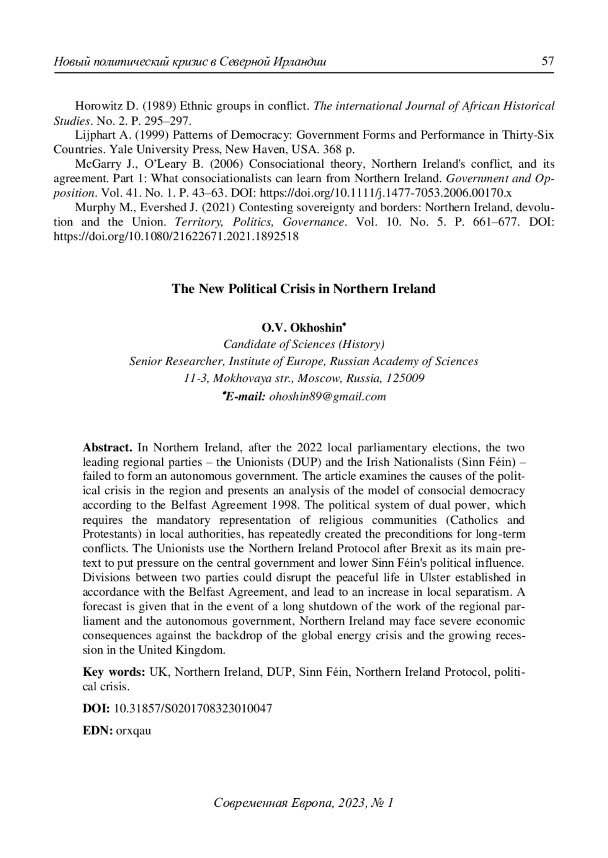 6. Охошин О.В. (2019) Североирландский вопрос снова мешает брекзиту. Научно-аналитический вестник ИЕ РАН. № 6. С. 24-29. DOI: 10.15211/vestnikieran620192429 EDN: RXGLWO