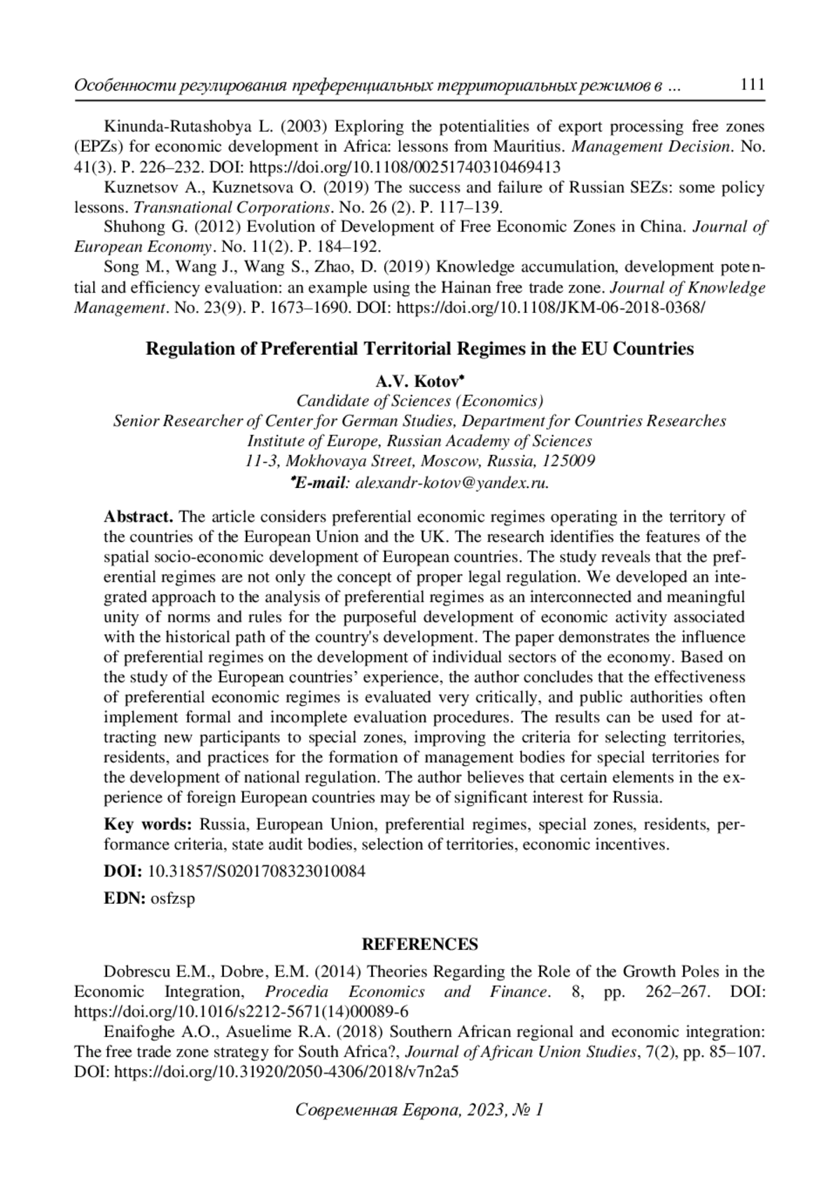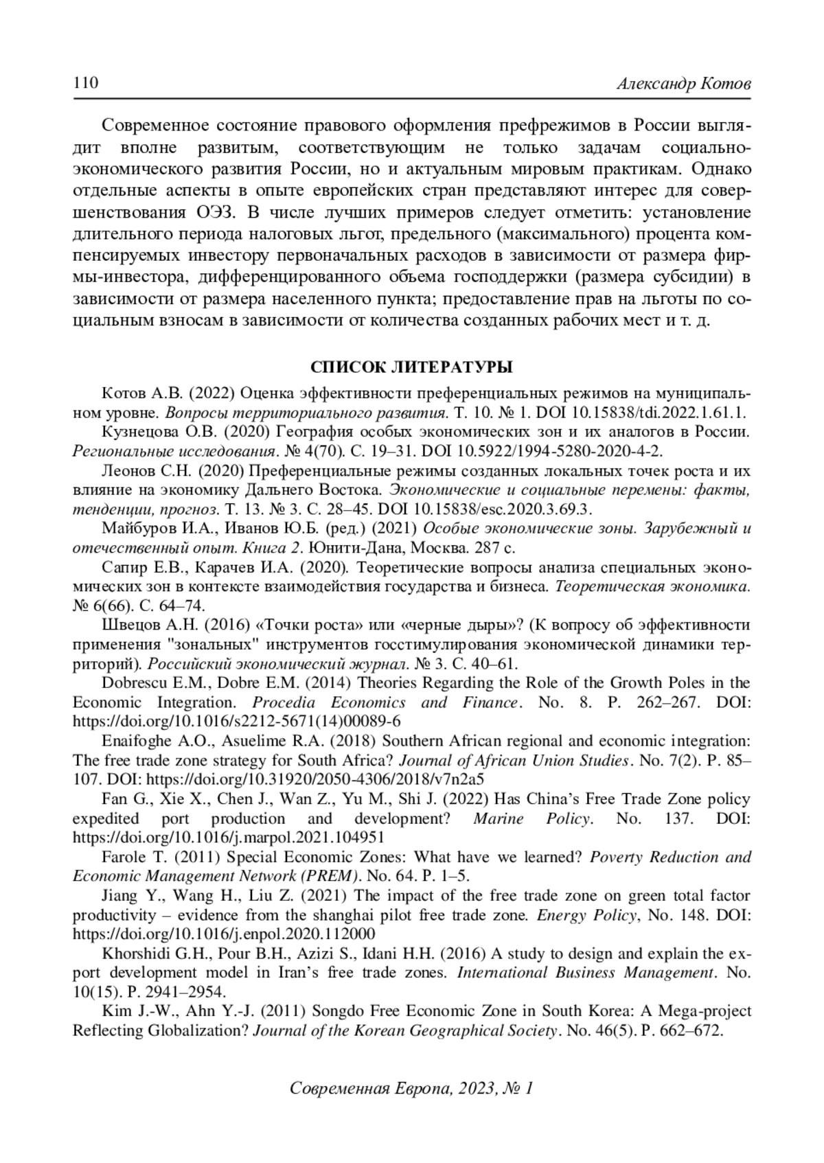1. Котов А.В. (2022) Оценка эффективности преференциальных режимов на муниципальном уровне. Вопросы территориального развития. Т. 10. № 1. DOI: 10.15838/tdi.2022.1.61.1 EDN: QKHRRN