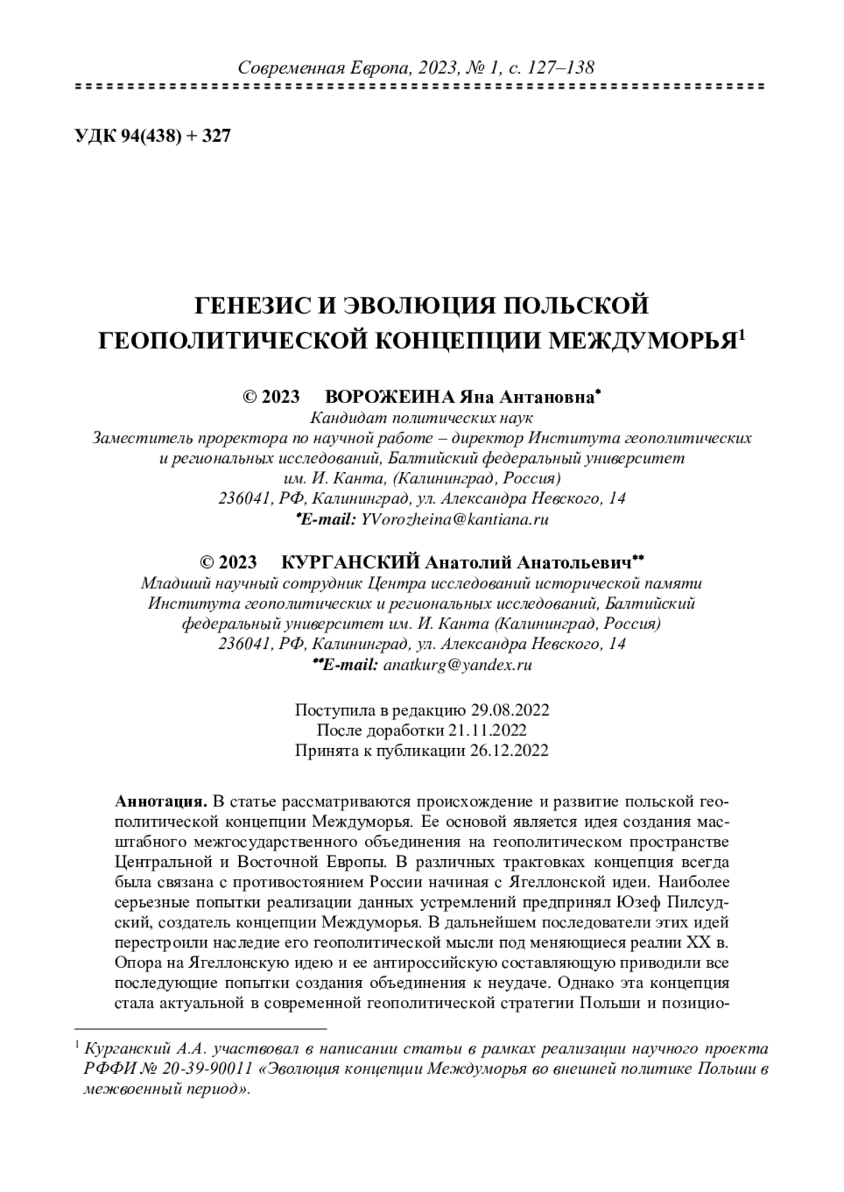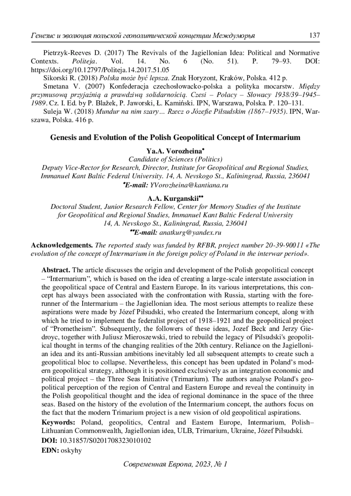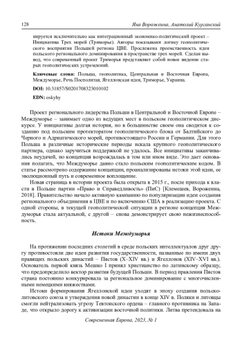 В статье рассматриваются происхождение и развитие польской геополитической концепции Междуморья. Ее основой является идея создания масштабного межгосударственного объединения на геополитическом пространстве Центральной и Восточной Европы. В различных трактовках концепция всегда была связана с противостоянием России начиная с Ягеллонской идеи. Наиболее серьезные попытки реализации данных устремлений предпринял Юзеф Пилсудский, создатель концепции Междуморья. В дальнейшем последователи этих идей перестроили наследие его геополитической мысли под меняющиеся реалии XX в. Опора на Ягеллонскую идею и ее антироссийскую составляющую приводили все последующие попытки создания объединения к неудаче. Однако эта концепция стала актуальной в современной геополитической стратегии Польши и позиционируется исключительно как интеграционный экономико-политический проект ‒ Инициатива Трех морей (Триморье). Авторы показывают логику геополитического восприятия Польшей региона ЦВЕ. Прослежена преемственность идеи польского регионального доминирования в пространстве трех морей. Сделан вывод, что современный проект Триморья представляет собой новое видение старых геополитических устремлений