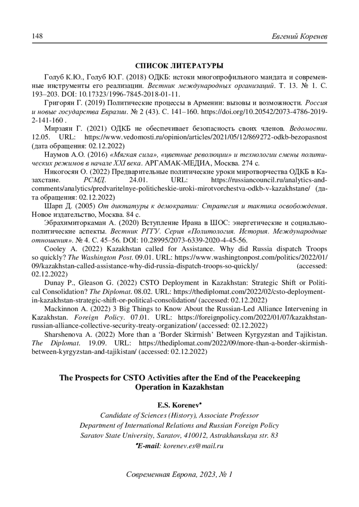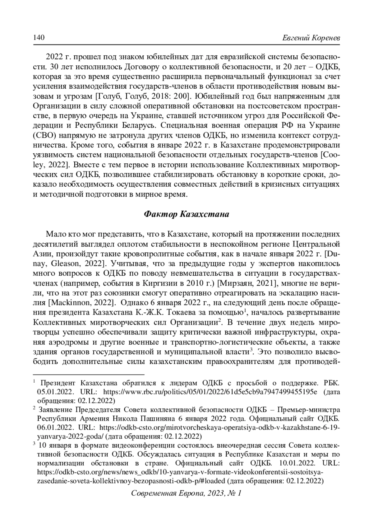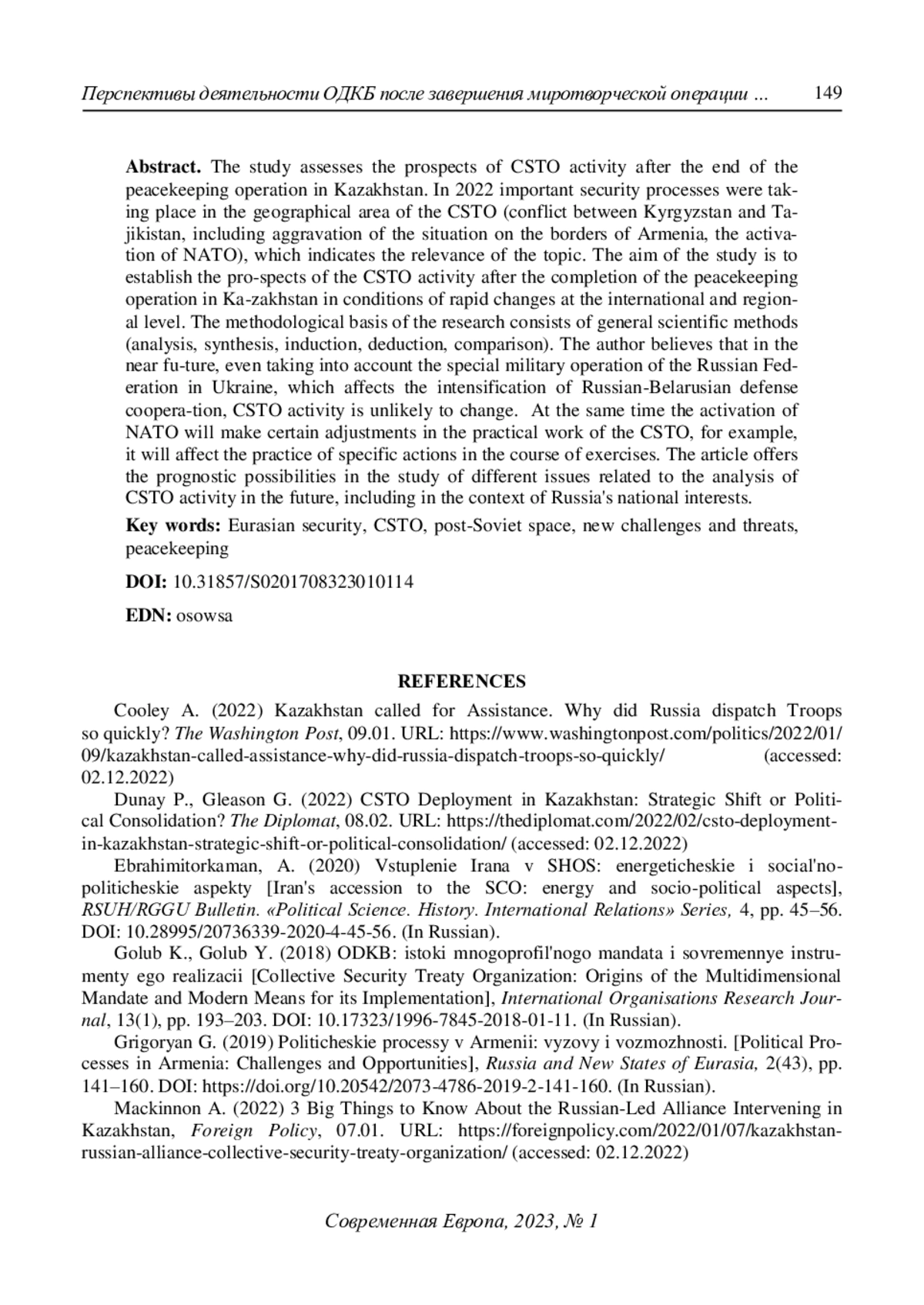 10. Mackinnon А. (2022) 3 Big Things to Know About the Russian-Led Alliance Intervening in Kazakhstan. Foreign Policy. 07.01. URL: https://foreignpolicy.com/2022/01/07/kazakhstan-russian-alliance-collective-security-treaty-organization/(accessed: 02.12.2022).