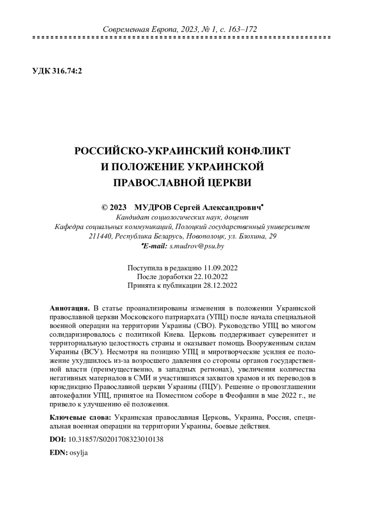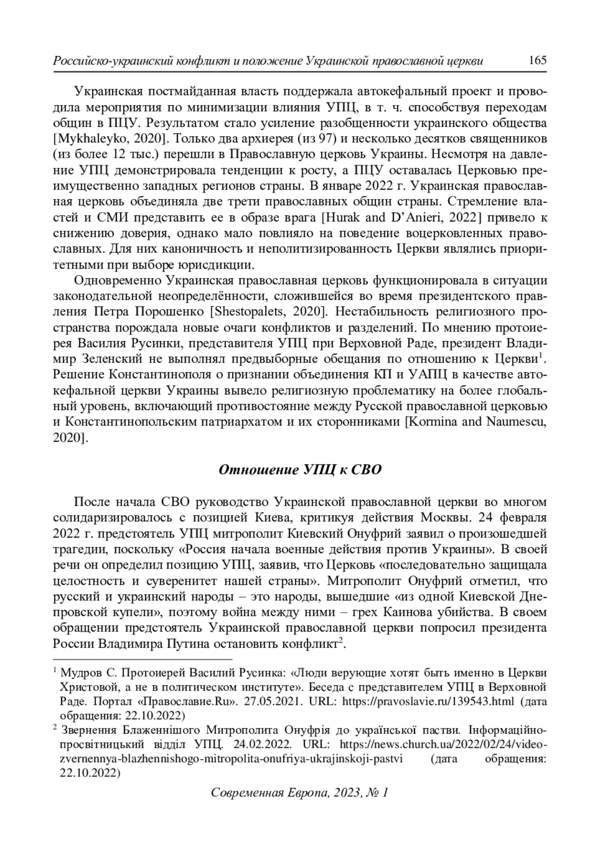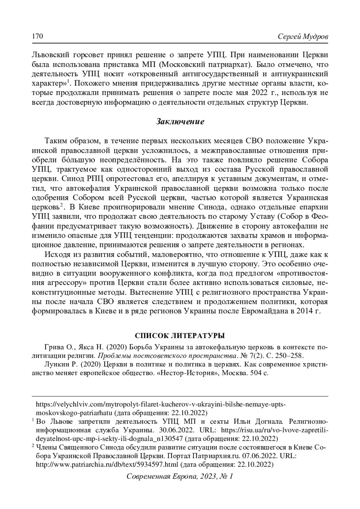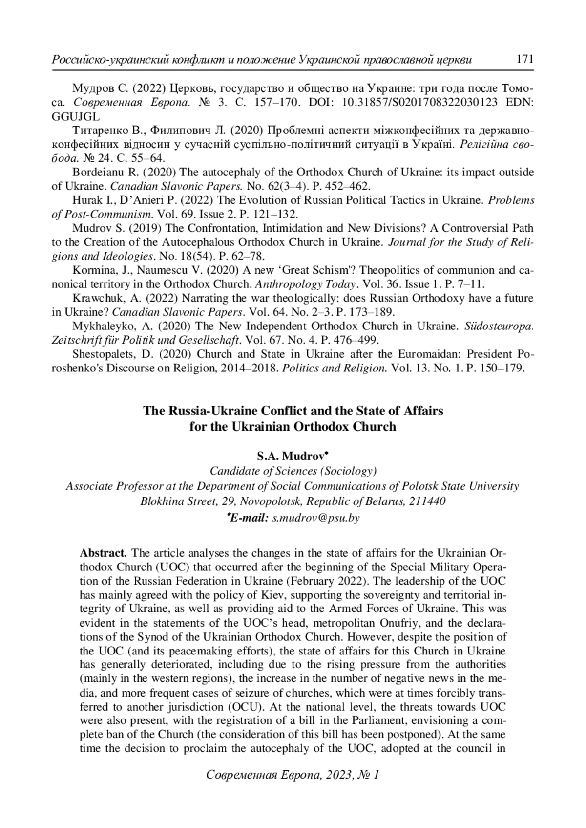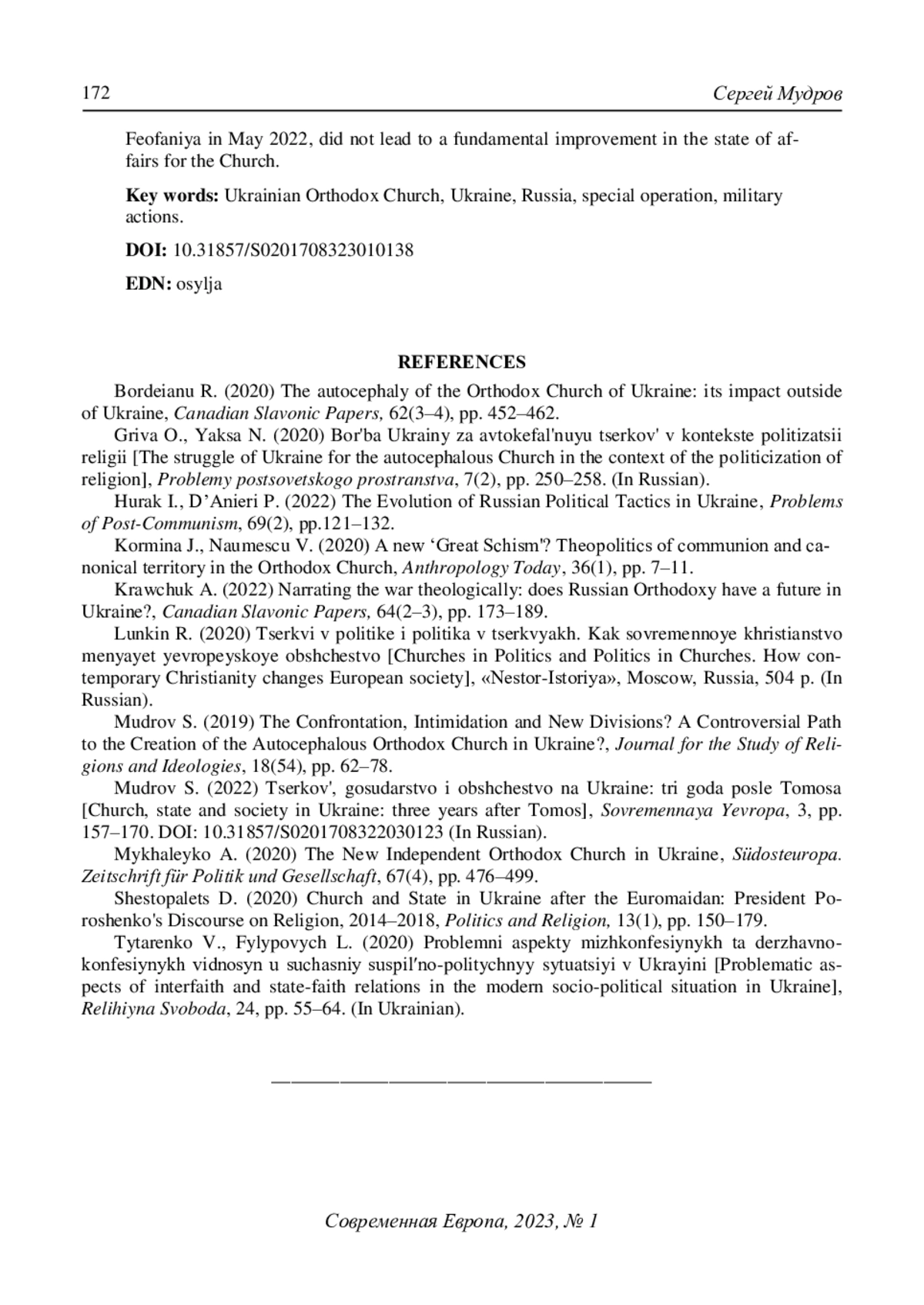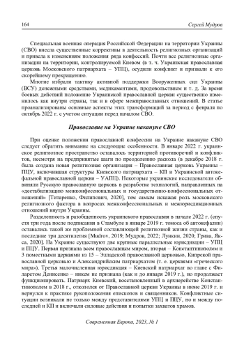 3. Мудров С. (2022) Церковь, государство и общество на Украине: три года после Томоса. Современная Европа. № 3. С. 157-170. DOI: 10.31857/S0201708322030123 EDN: GGUJGL