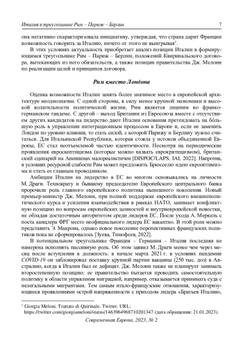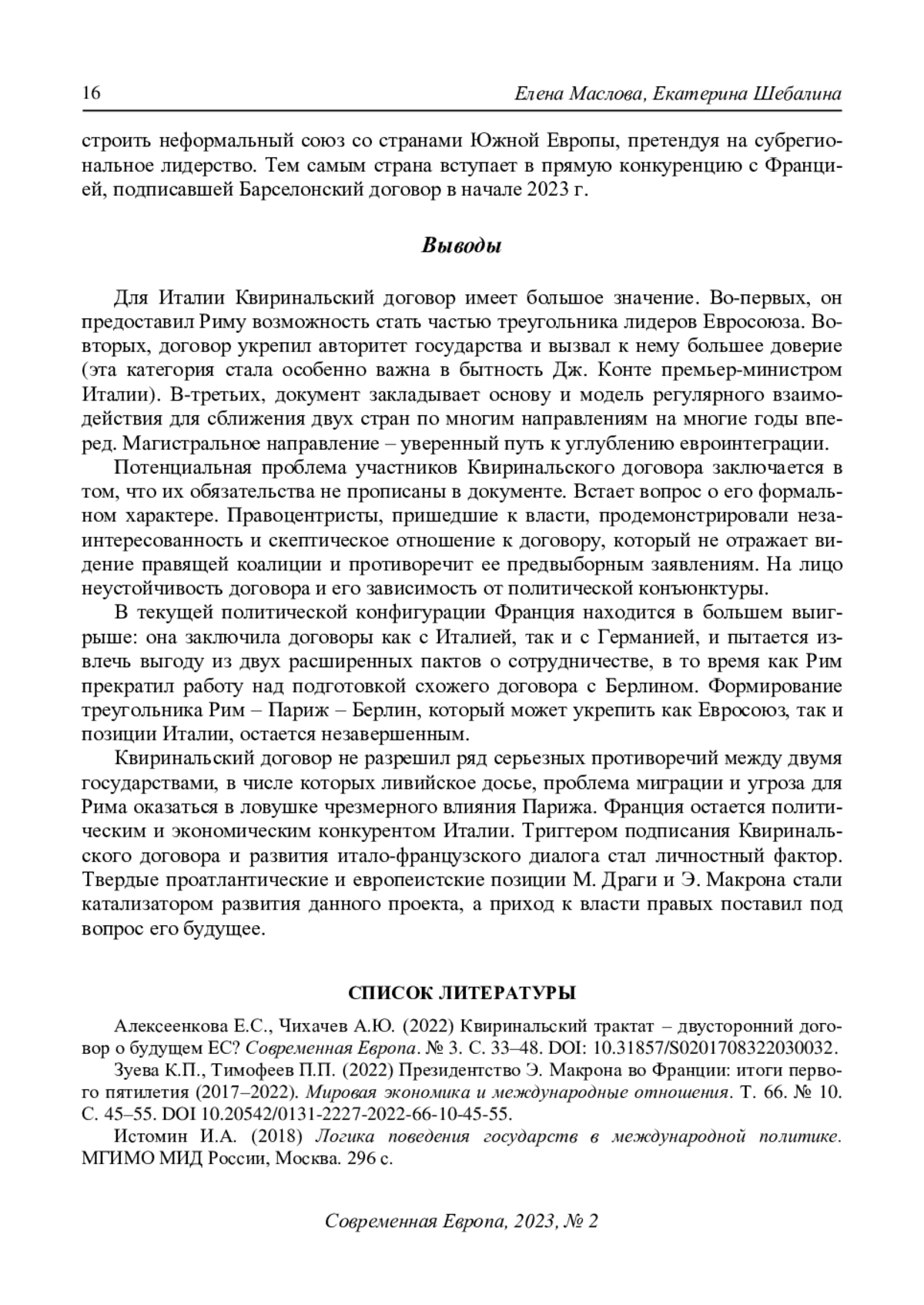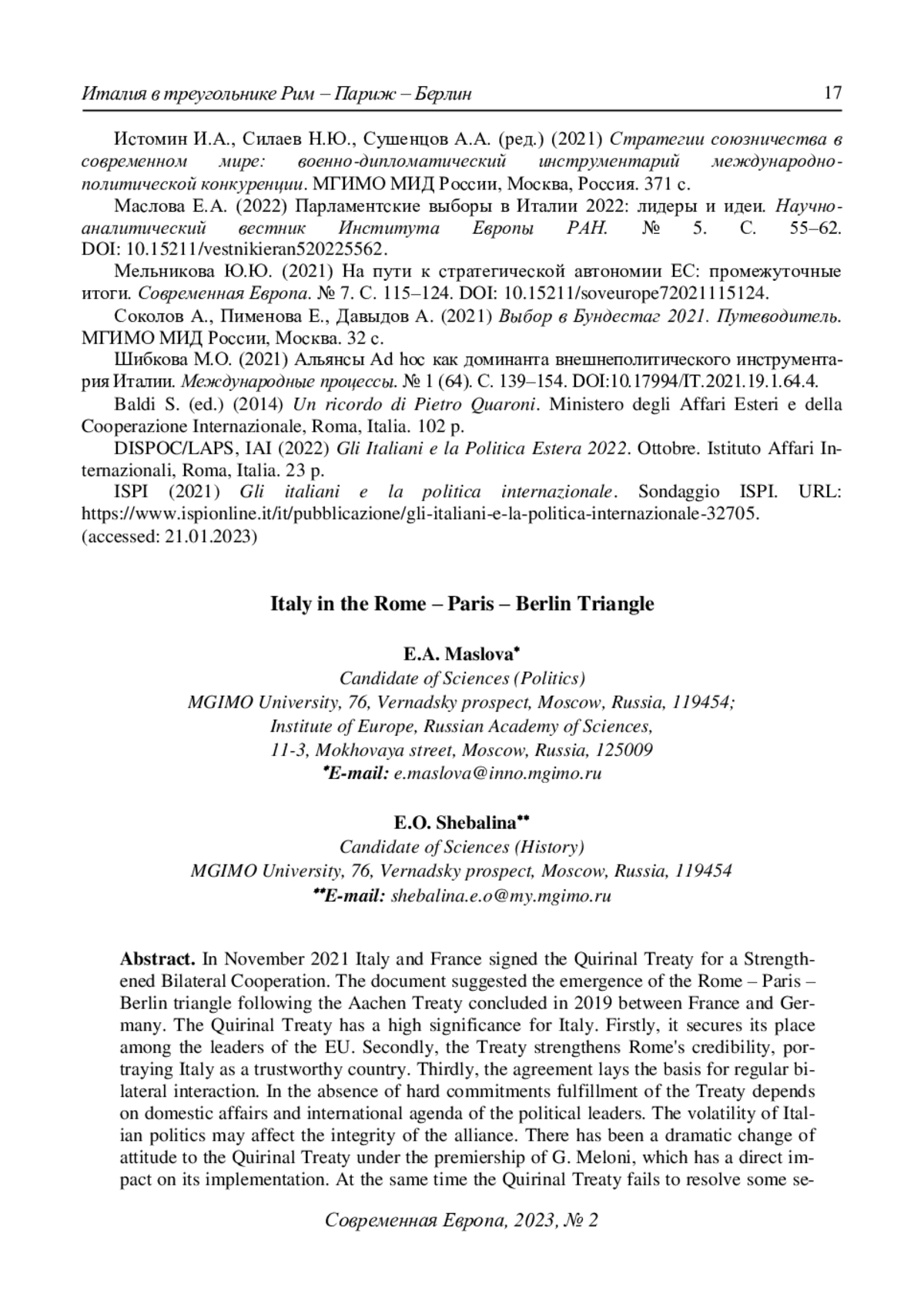 1. Алексеенкова Е.С., Чихачев А.Ю. (2022) Квиринальский трактат - двусторонний договор о будущем ЕС? Современная Европа. № 3. С. 33-48. DOI: 10.31857/S0201708322030032 EDN: GEUIUF