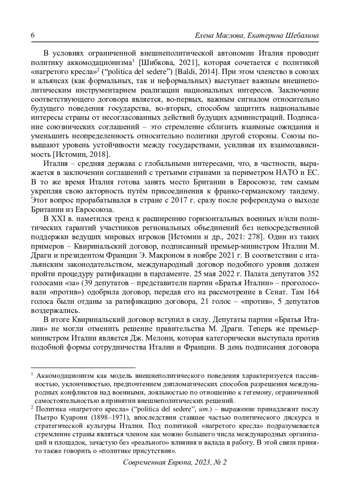 В условиях ограниченной внешнеполитической автономии Италия проводит политику аккомодационизма1 [Шибкова, 2021], которая сочетается с политикой «нагретого кресла»2 (“politica del sedere”) [Baldi, 2014]. При этом членство в союзах и альянсах (как формальных, так и неформальных) выступает важным внешнеполитическим инструментарием реализации национальных интересов. Заключение соответствующего договора является, во-первых, важным сигналом относительно будущего поведения государства, во-вторых, способом защитить национальные интересы страны от несогласованных действий будущих администраций. Подписание союзнических соглашений – это стремление сблизить взаимные ожидания и уменьшить неопределенность относительно политики другой стороны. Союзы повышают уровень устойчивости между государствами, усиливая их взаимозависимость [Истомин, 2018]