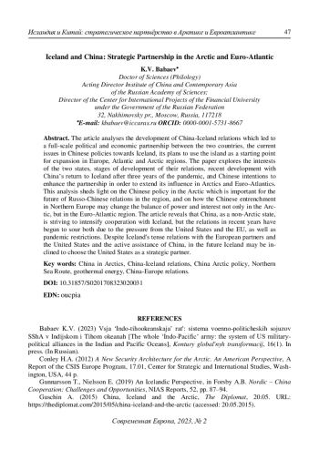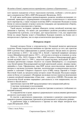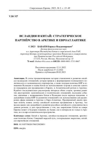 В статье проанализирована история становления и развития китайско-исландских отношений, которая привела к формированию полноценного политического и экономического партнерства, а также текущая политика КНР в отношении Исландии и планы Китая по использованию острова в качестве одного из плацдармов для продвижения в Европу, в Атлантический регион и Арктику. В работе последовательно рассмотрены интересы обеих сторон, хроника развития двусторонних экономических и политических отношений, последние события, связанные с возвращением Китая в Исландию после периода пандемии, и дальнейшие планы КНР по развитию отношений и их использованию для расширения сферы влияния в Арктике и Евро-Атлантике. Предпринятый анализ призван помочь понять логику китайской политики продвижения в Арктику, что весьма важно для дальнейшего развития российско-китайского сотрудничества в данном регионе, и дать представление о том, как закрепление Китая на севере Европы может в будущем повлиять на баланс сил и интересов не только в Арктике, но и в евро-атлантическом пространстве