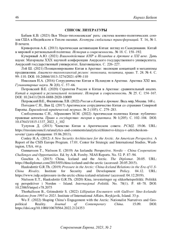 17. Wu F. (2022) Shaping China’s Engagement with the Arctic: Nationalist Narratives and Geopolitical Reality. Journal of Contemporary China. 15.09. DOI: 10.1080/10670564.2022.2124353 EDN: VFLSBJ