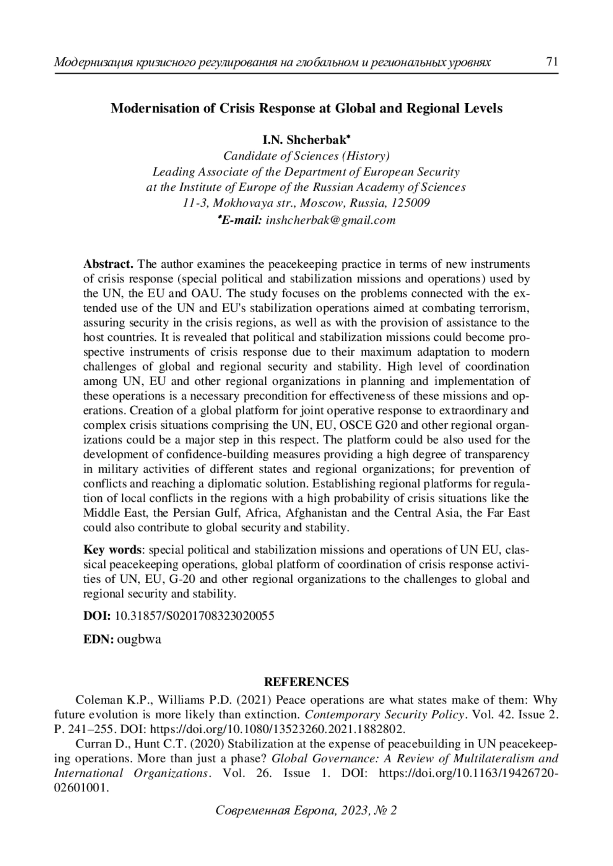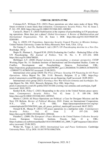 1. Coleman K.P., Williams P.D. (2021) Peace operations are what states make of them: Why future evolution is more likely than extinction. Contemporary Security Policy. Vol. 42. Issue 2. P. 241-255. DOI: 10.1080/13523260.2021.1882802 EDN: XJMHVB