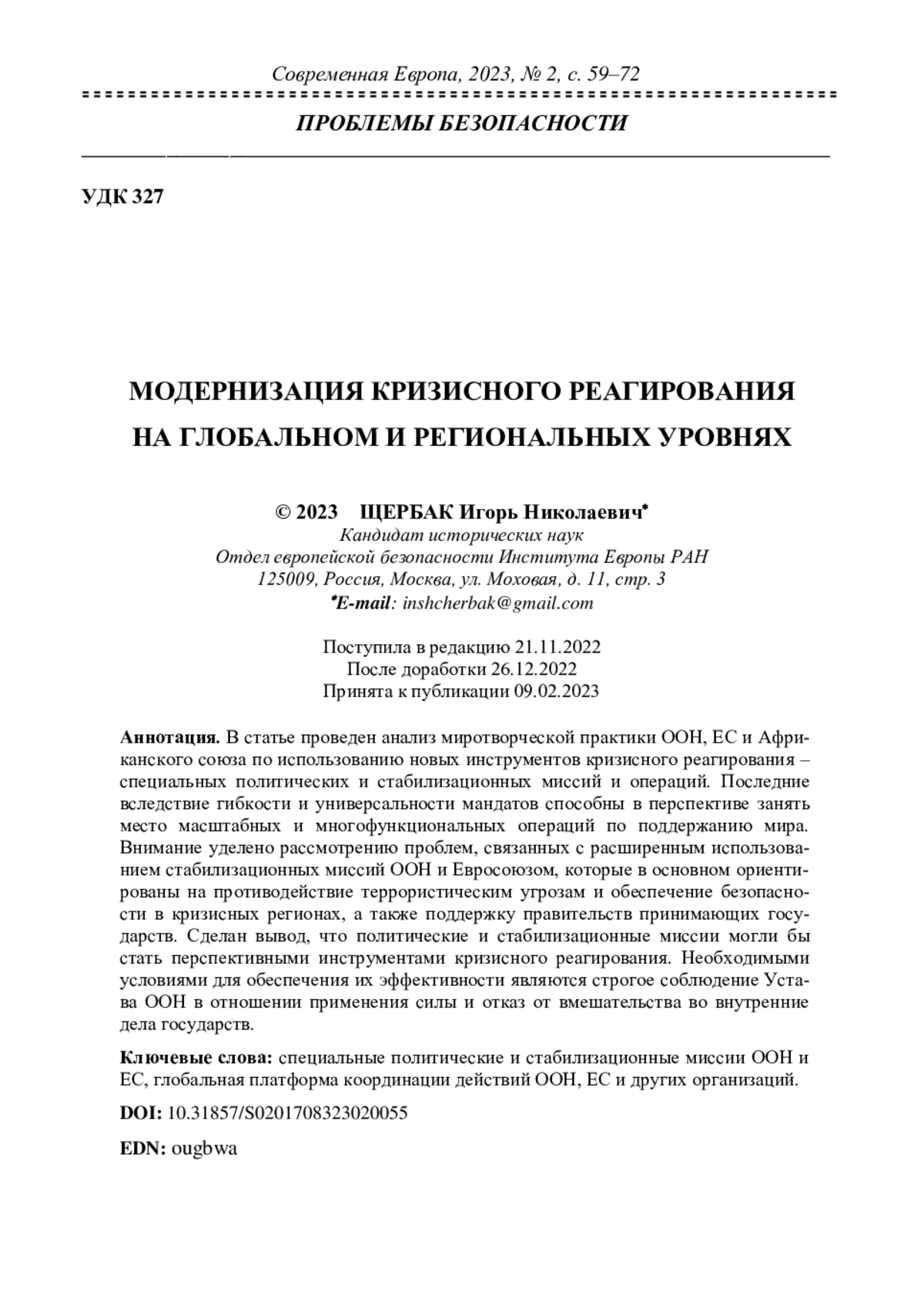 В статье проведен анализ миротворческой практики ООН, ЕС и Африканского союза по использованию новых инструментов кризисного реагирования – специальных политических и стабилизационных миссий и операций. Последние вследствие гибкости и универсальности мандатов способны в перспективе занять место масштабных и многофункциональных операций по поддержанию мира. Внимание уделено рассмотрению проблем, связанных с расширенным использованием стабилизационных миссий ООН и Евросоюзом, которые в основном ориентированы на противодействие террористическим угрозам и обеспечение безопасности в кризисных регионах, а также поддержку правительств принимающих государств. Сделан вывод, что политические и стабилизационные миссии могли бы стать перспективными инструментами кризисного реагирования. Необходимыми условиями для обеспечения их эффективности являются строгое соблюдение Устава ООН в отношении применения силы и отказ от вмешательства во внутренние дела государств