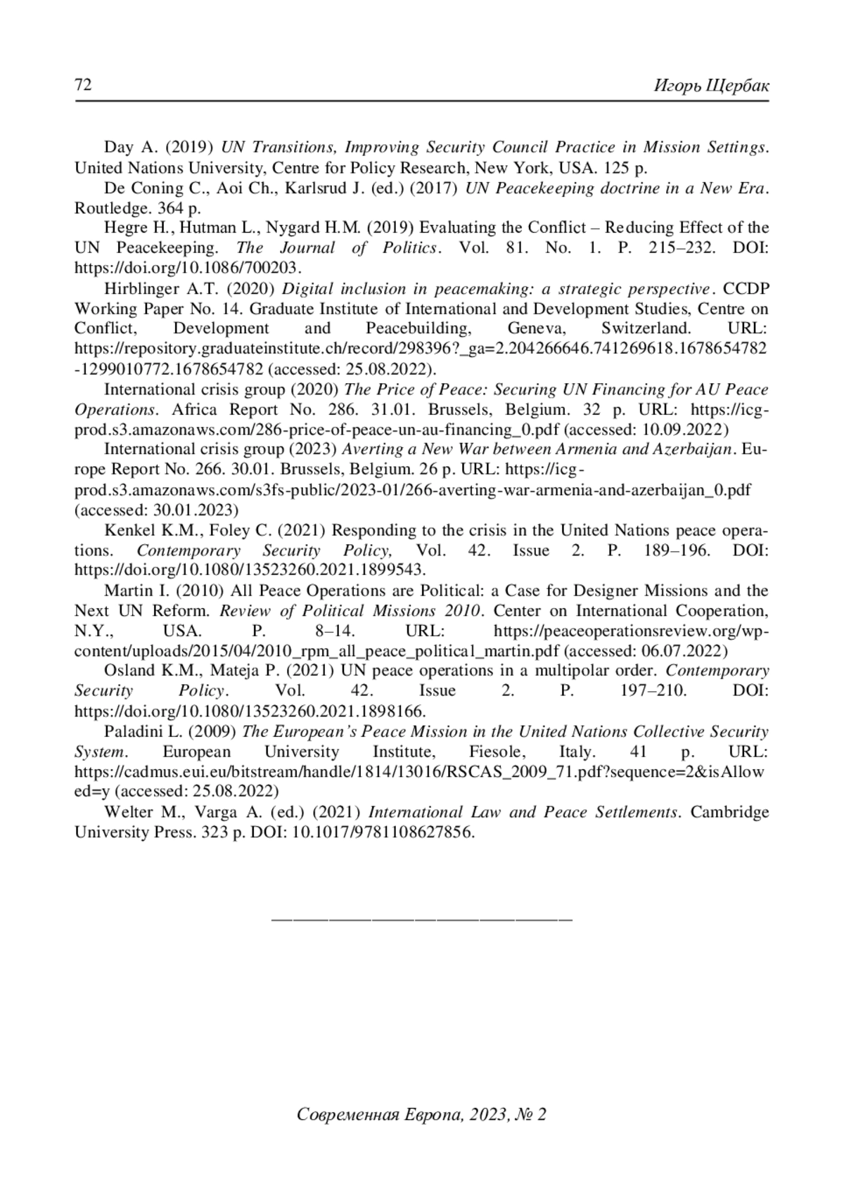 11. Osland K.M., Mateja P. (2021) UN peace operations in a multipolar order. Contemporary Security Policy. Vol. 42. Issue 2. P. 197-210. DOI: 10.1080/13523260.2021.1898166 EDN: QPVCAA