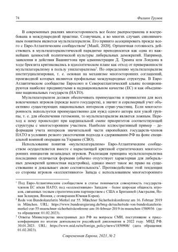 В современных реалиях многосторонность все более распространена и востребована в международной практике. Созвучным, а во многих случаях синонимичным понятием является мультилатерализм. Его принято ассоциировать прежде всего с Евро-Атлантическим сообществом1 [Maull, 2020]. Органичная готовность действовать в мультилатералистической парадигме преподносится как одна из важнейших ценностей политической культуры либеральных демократий. Например, заявления и действия Вашингтона при администрации Д. Трампа или Лондона в ходе брекзита критиковались в идеологическом плане как отход от приверженности мультилатерализму в пользу унилатерализма2. По определению мультилатерализм институциализирован, т. е. основан на механизме многосторонних соглашений, производной которых являются профильные международные структуры. В ЕвроАтлантическом сообществе Евросоюз и Североатлантический альянс позиционируются наиболее продвинутыми в наднациональном качестве (ЕС) и как объединение национальных государств (НАТО)