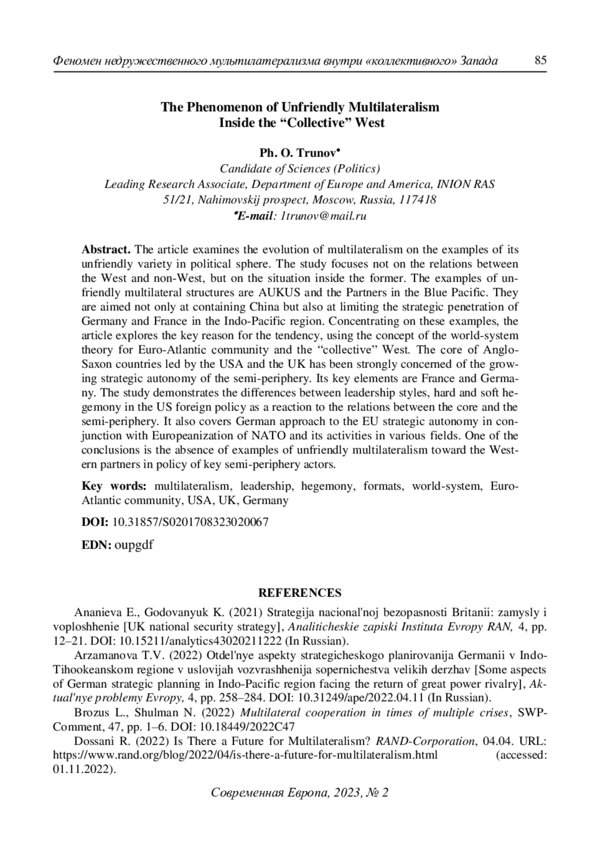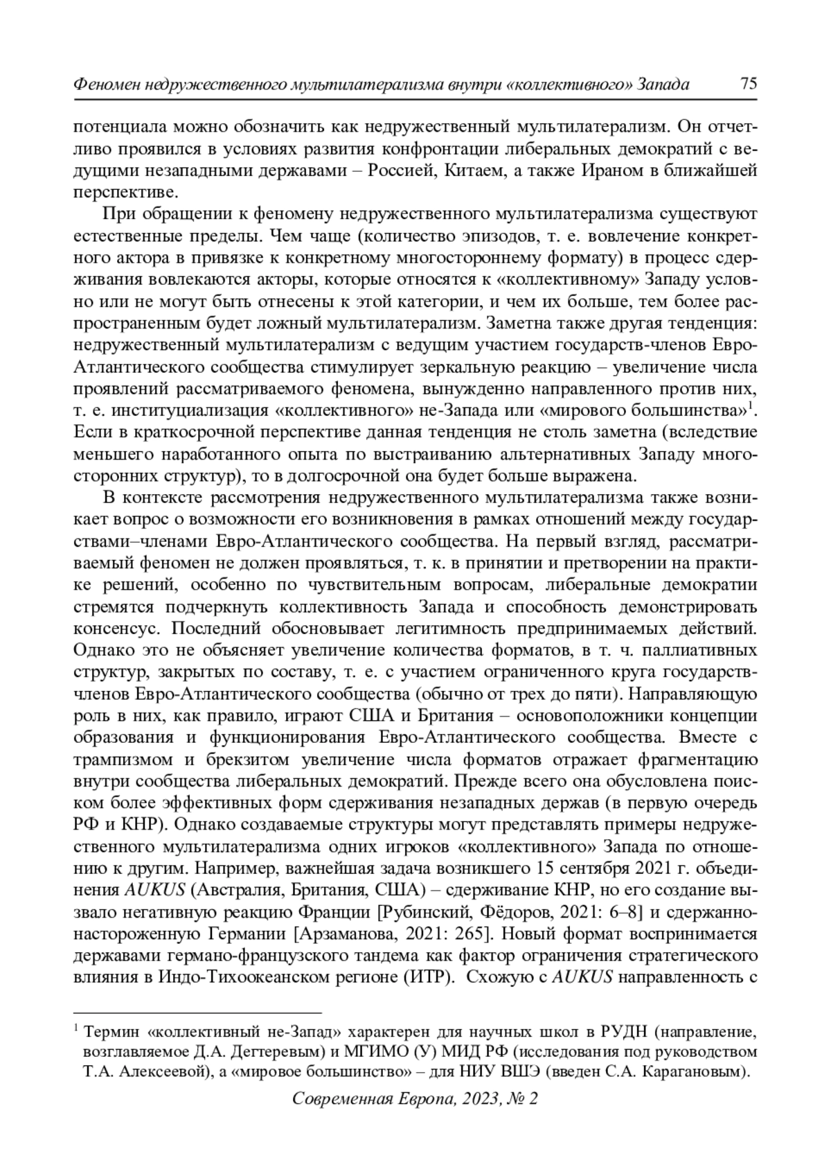 В статье осмыслена эволюция фактора многосторонности в политической сфере на примерах мультилатерализма недружественного характера. Внимание обращено не на восприятие Запада и не-Запада, а на ситуацию внутри первого. Форматы AUKUS и Partners in the Blue Pacific нацелены не только на сдерживание КНР, но и показывают стремление США и Британии ограничить процесс стратегического закрепления ФРГ и Франции в ИндоТихоокеанском регионе. Основная причина этой тенденции проявляется в обеспокоенности ядром Запада в лице англо-саксонских держав ростом стратегической автономности полупериферии Евро-Атлантического сообщества. Направляющую роль в ней играет не только Франция, но и объединенная Германия, отошедшая от положения периферии. В этой связи рассмотрено учащение переходов США от лидерства к гегемонии – жесткой и мягкой. Раскрыт характер подхода ФРГ к наделению ЕС стратегической автономией вместе с европеизацией НАТО в различных проявлениях. Отмечено отсутствие примеров недружественного мультилатерализма со стороны Берлина и Парижа по отношению к западным партнерам