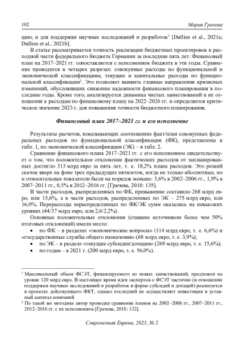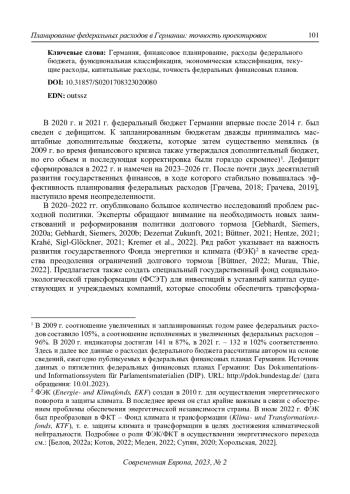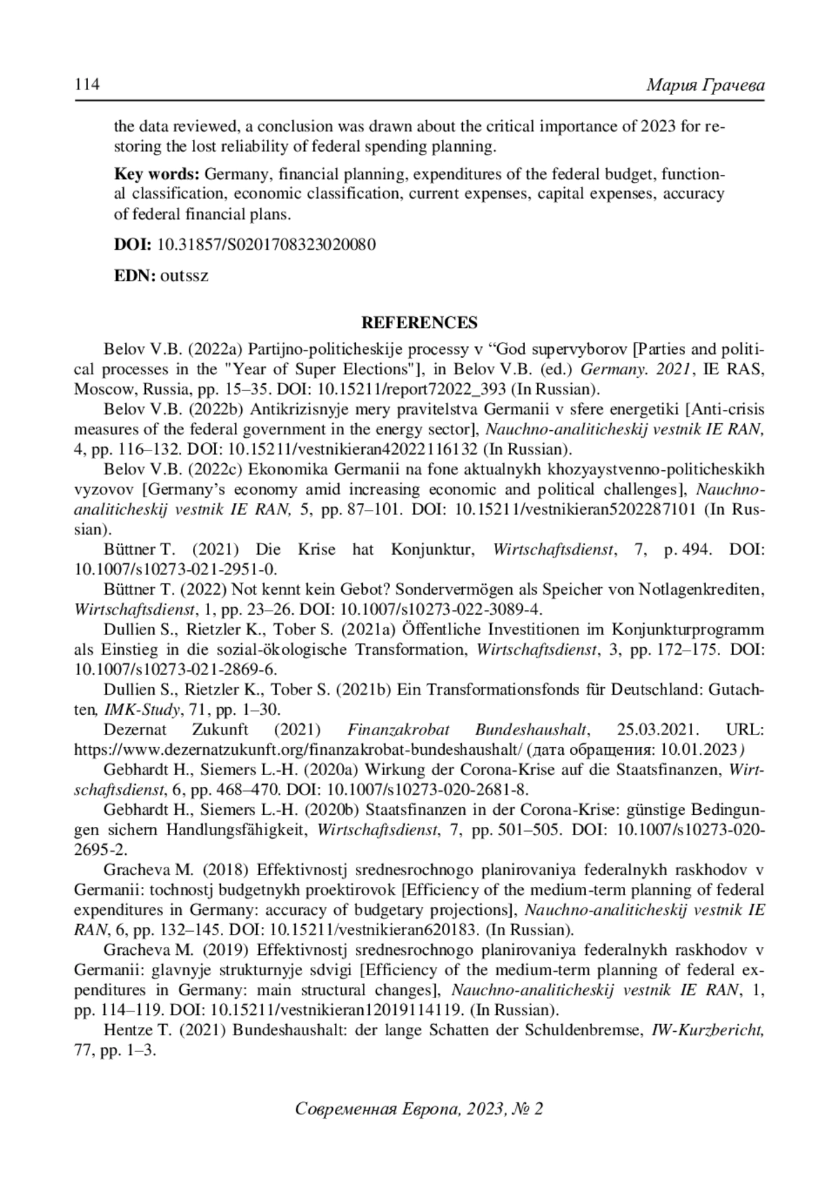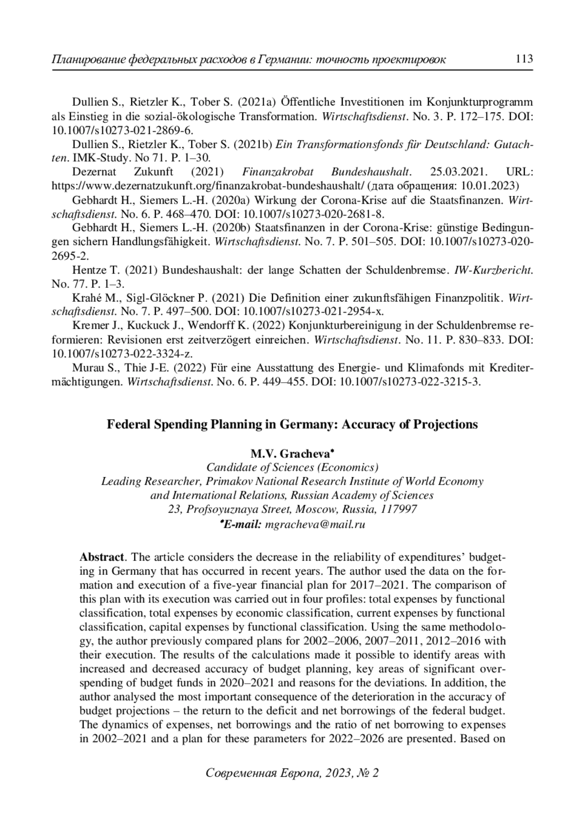5. Грачева М.В. (2019) Эффективность среднесрочного планирования федеральных расходов в Германии: главные структурные сдвиги. Научно-аналитический вестник ИЕ РАН. № 1. С. 114-119. DOI: 10.15211/vestnikieran12019114119 EDN: ZCOKGL