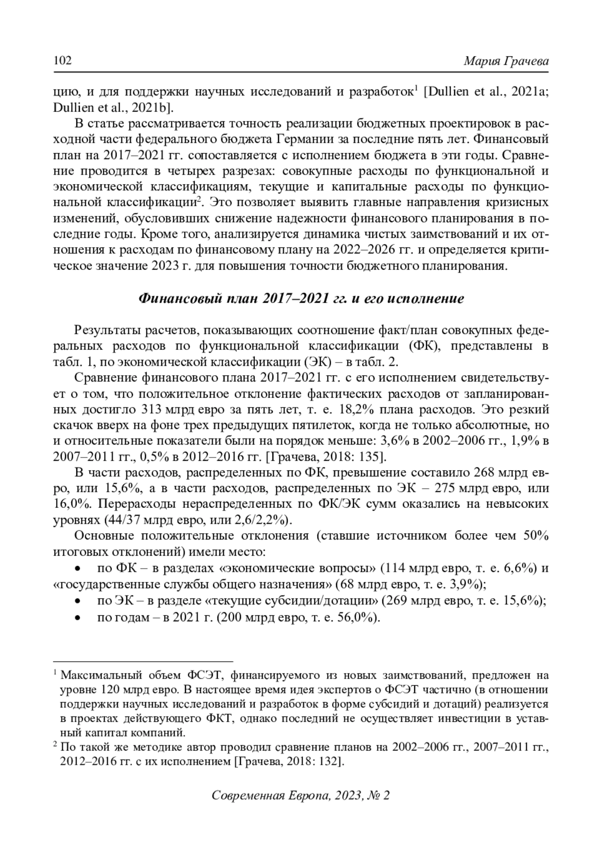 В 2020 г. и 2021 г. федеральный бюджет Германии впервые после 2014 г. был сведен с дефицитом. К запланированным бюджетам дважды принимались масштабные дополнительные бюджеты, которые затем существенно менялись (в 2009 г. во время финансового кризиса также утверждался дополнительный бюджет, но его объем и последующая корректировка были гораздо скромнее)1. Дефицит сформировался в 2022 г. и намечен на 2023‒2026 гг. После почти двух десятилетий развития государственных финансов, в ходе которого стабильно повышалась эффективность планирования федеральных расходов [Грачева, 2018; Грачева, 2019], наступило время неопределенности