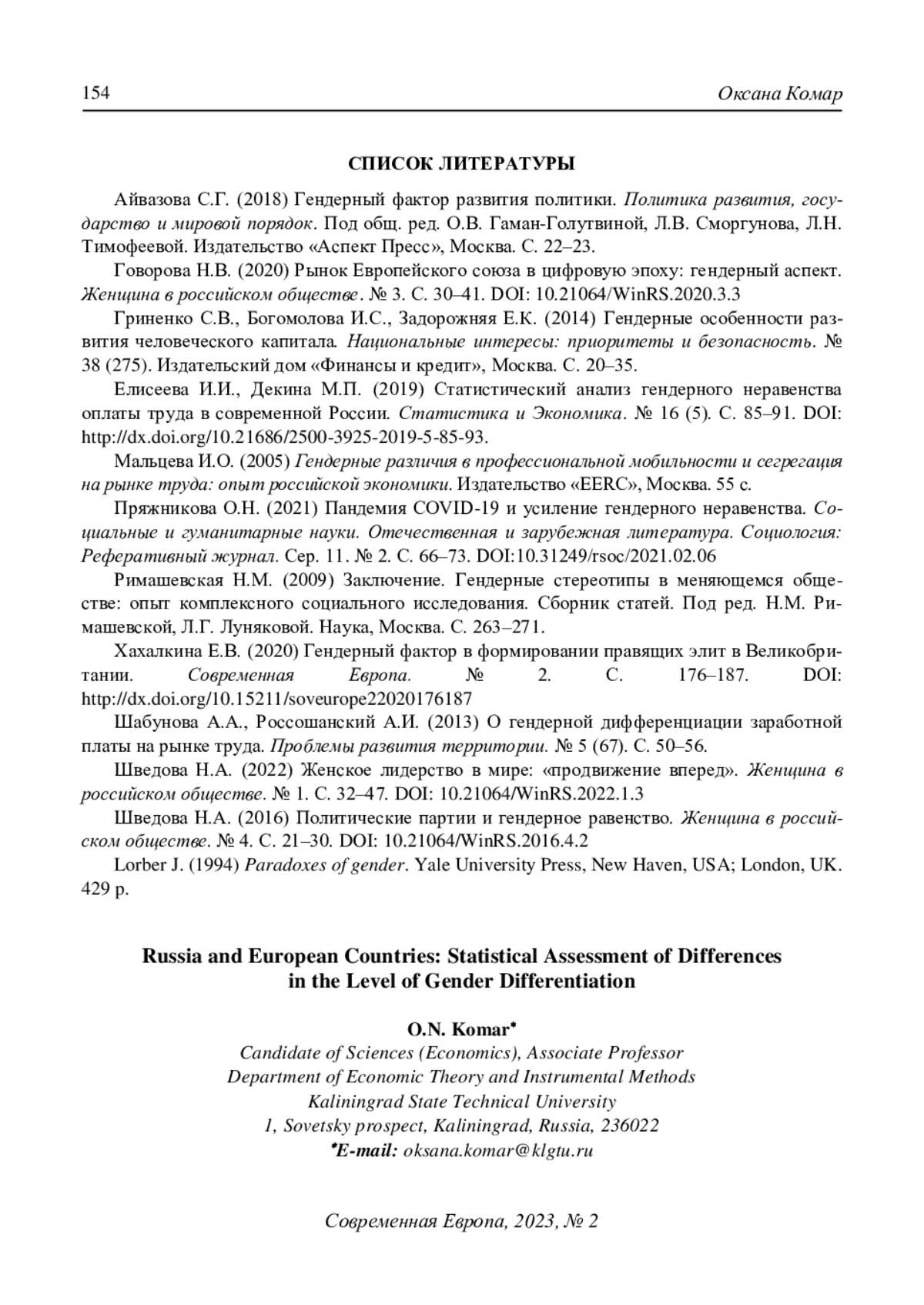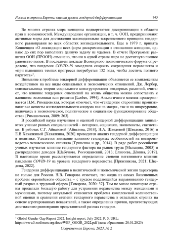 6. Пряжникова О.Н. (2021) Пандемия COVID-19 и усиление гендерного неравенства. Социальные и гуманитарные науки. Отечественная и зарубежная литература. Социология: Реферативный журнал. Сер. 11. № 2. С. 66-73. DOI: 10.31249/rsoc/2021.02.06 EDN: TLWNQC