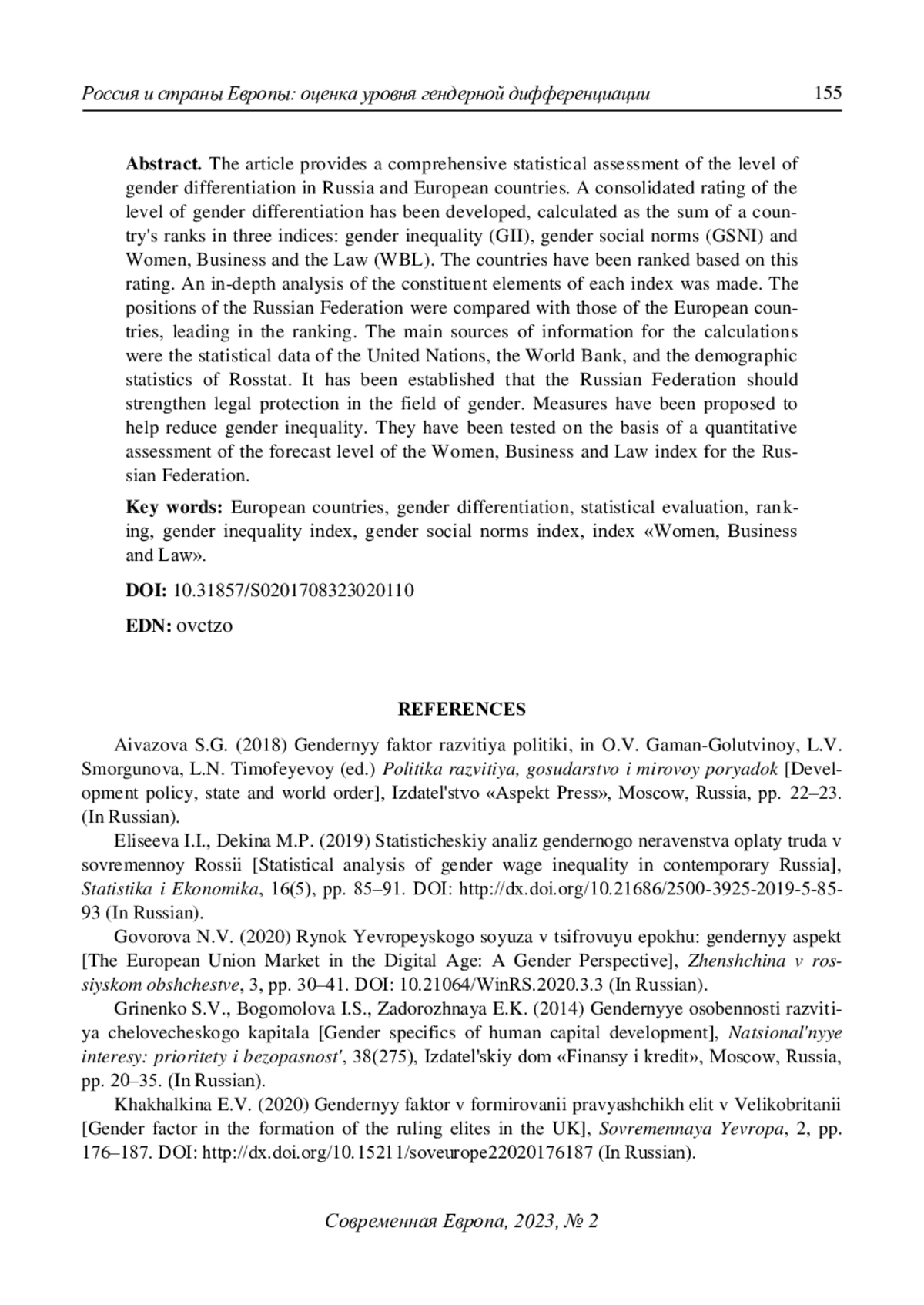 2. Говорова Н.В. (2020) Рынок Европейского союза в цифровую эпоху: гендерный аспект. Женщина в российском обществе. № 3. С. 30-41. DOI: 10.21064/WinRS.2020.3.3 EDN: TKYNEW