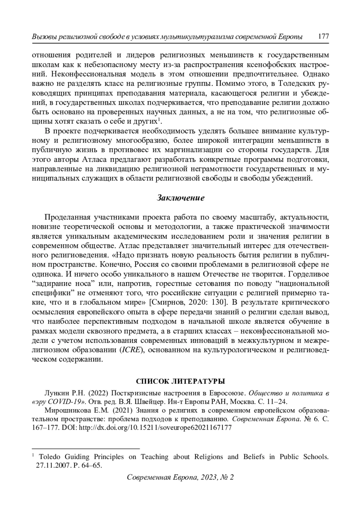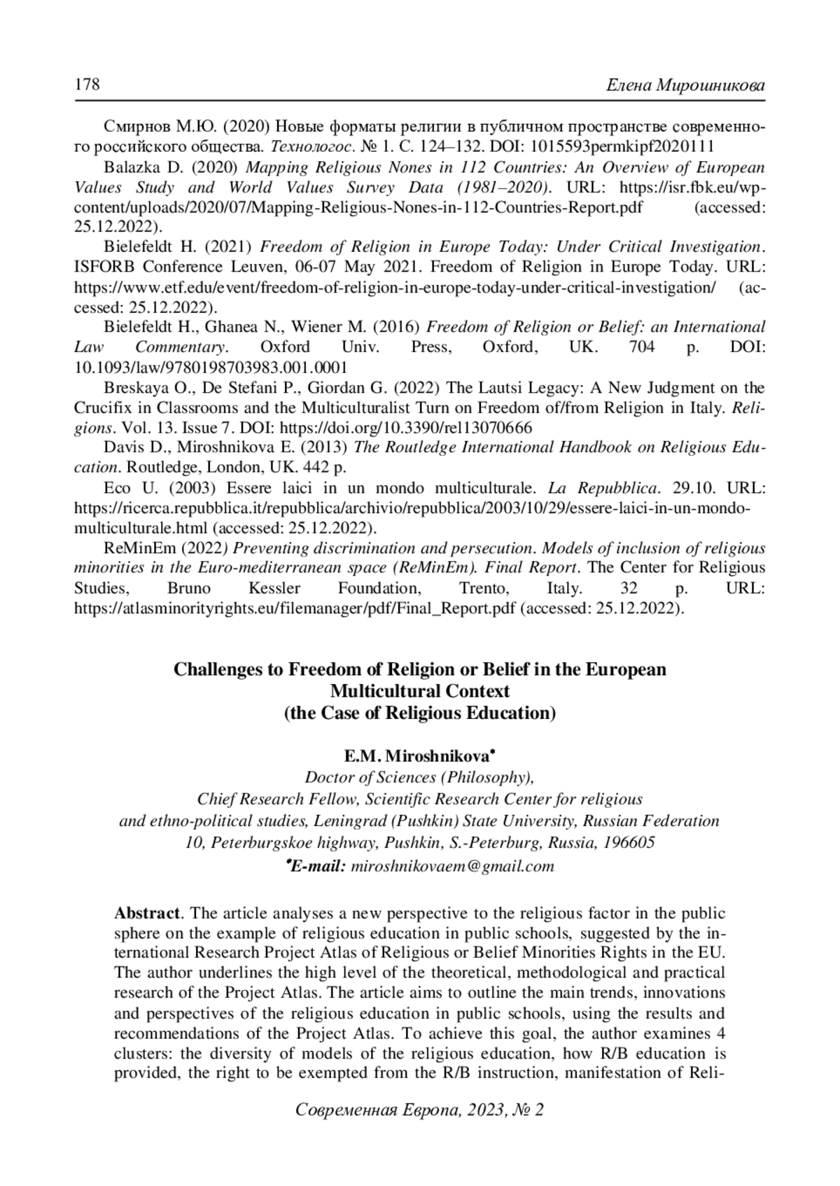 2. Мирошникова Е.М. (2021) Знания о религиях в современном европейском образовательном пространстве: проблема подходов к преподаванию. Современная Европа. № 6. С. 167-177. DOI: 10.15211/soveurope62021167177 EDN: AFFYMG