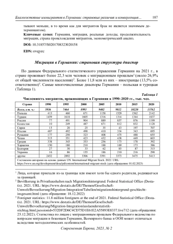 По данным Федерального статистического управления Германии на 2021 г., в стране проживает более 22,3 млн человек с миграционным прошлым1 (около 26,9% от общей численности населения)2. Более 11,8 млн из них – иностранцы (13,5% соответственно)3. Самые многочисленные диаспоры Германии – польская и турецкая (Таблица 1).