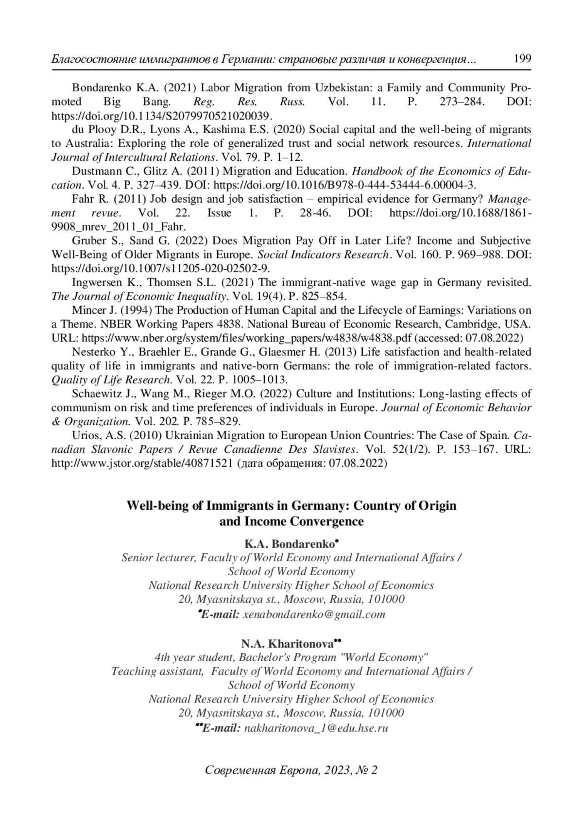 20. Nesterko Y., Braehler E., Grande G., Glaesmer H. (2013) Life satisfaction and health-related quality of life in immigrants and native-born Germans: the role of immigration-related factors. Quality of Life Research. Vol. 22. P. 1005-1013.