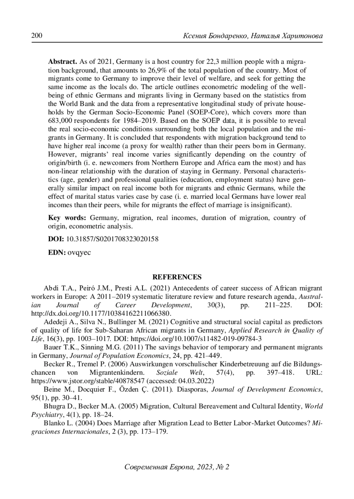 В статье проведено эконометрическое моделирование уровня благосостояния этнических немцев и мигрантов, проживающих в Германии, на основе статистики Всемирного банка и данных опроса Немецкой социальноэкономической группы (SOEP-Core) по более чем 683000 респондентам за 1984‒2019 гг. Данные SOEP отражают реальные социально-экономические условия жизни этнического населения и мигрантов в Германии. В исследовании сделан вывод, что реальный доход (прокси уровня благосостояния) у респондентов с миграционным прошлым, в среднем выше, чем у лиц, рожденных в Германии. Однако уровень реального дохода мигрантов значительно варьируется в зависимости от страны-происхождения (наиболее высокий характерен для мигрантов из стран Северной Европы и Африки) и имеет нелинейную зависимость от времени проживания в стране. В статье выявлено, что влияние личностных характеристик (возраст, пол) и профессиональных качеств (образование, занятость) на реальный доход не сильно различается между мигрантами и этническими немцами, что нельзя сказать о семейном положении (коренные немцы в браке зарабатывают меньше, в то время как для мигрантов брак не является значимым детерминантом)