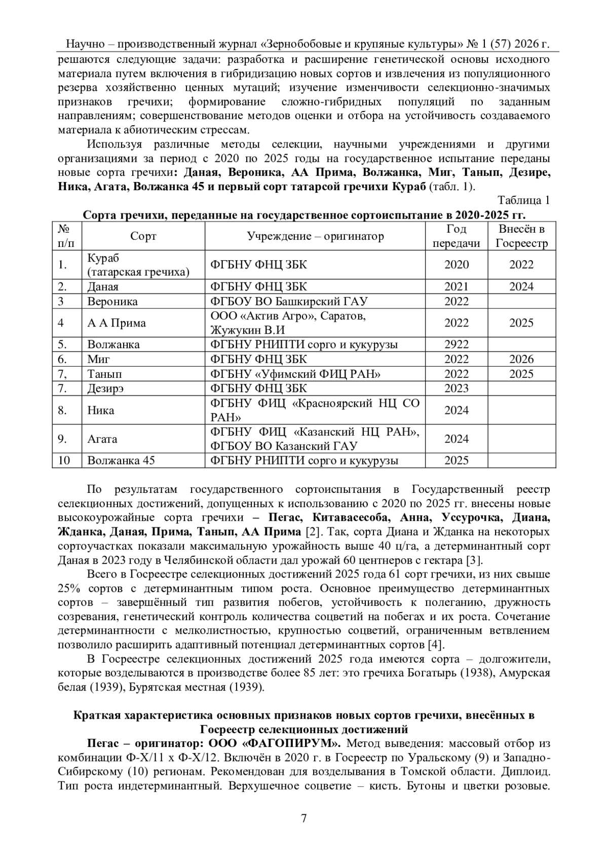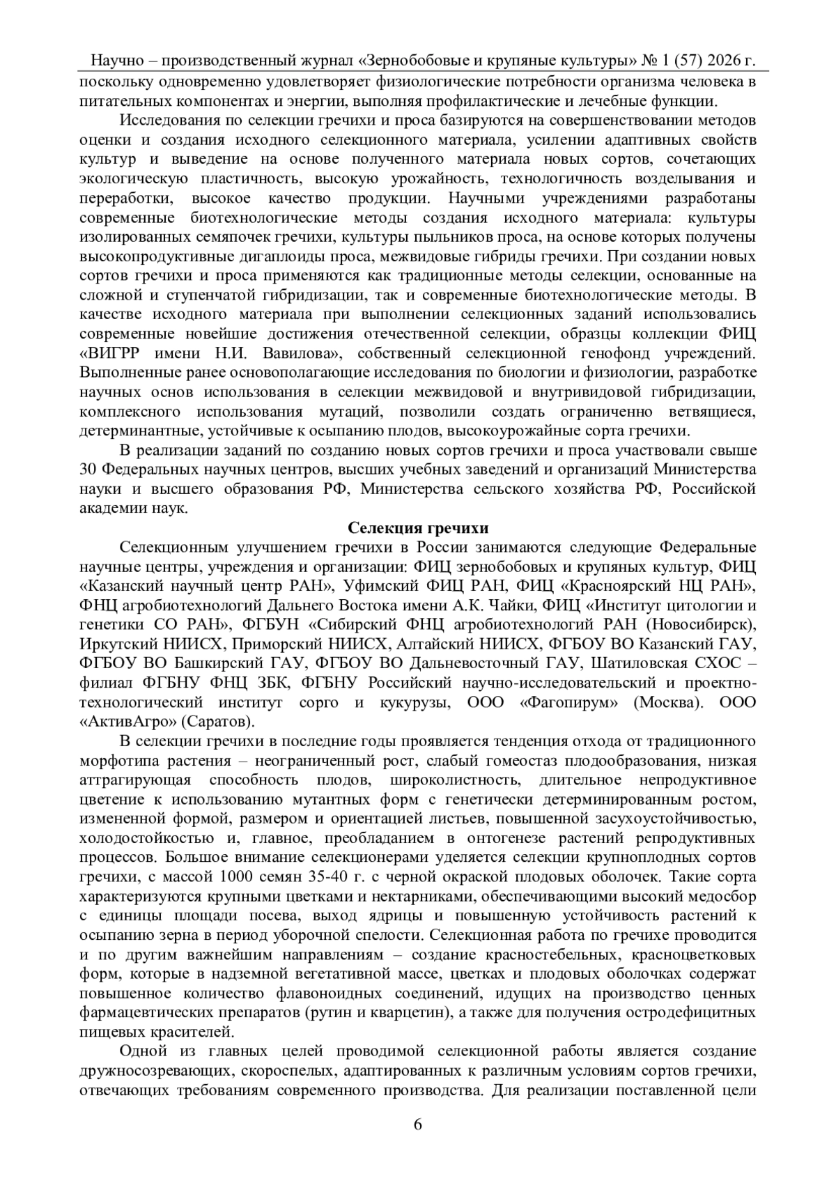 Развитие агропромышленного комплекса в современных условиях не возможны без использования селекционных достижений и новые сорта, являясь составной частью развития инновационных технологий, играют определённую роль в увеличении производства продукции растениеводства. Научные концепции селекционного процесса по различным сельскохозяйственным культурам, включая гречиху и просо, направлены на создание сортов с высокой адаптивностью к факторам внешней среды, к изменяющимся климатическим условиям вегетации. Важна не только селекция на продуктивность, но и на качество продукции, скороспелость, устойчивость к дефициту влаги, вредителям и болезням [1]. Всё это необходимо для обеспечения продовольственной независимости страны, как составной части национальной безопасности государства. Кроме зерновых культур, важной составляющей для сельского хозяйства и перерабатывающей промышленности страны являются крупяные культуры, традиционно использующиеся народами России. В первую очередь гречиха, просо и рис. Крупяные культуры – гречиха и просо входят в баланс зерна страны и являются сырьём для получения полноценных продуктов питания населения. В современных условиях возрастает роль гречихи как одного из относительно дешёвых полноценных продуктов питания. По своим потребительским свойствам она уникальна, поскольку одновременно удовлетворяет физиологические потребности организма человека в питательных компонентах и энергии, выполняя профилактические и лечебные функции.