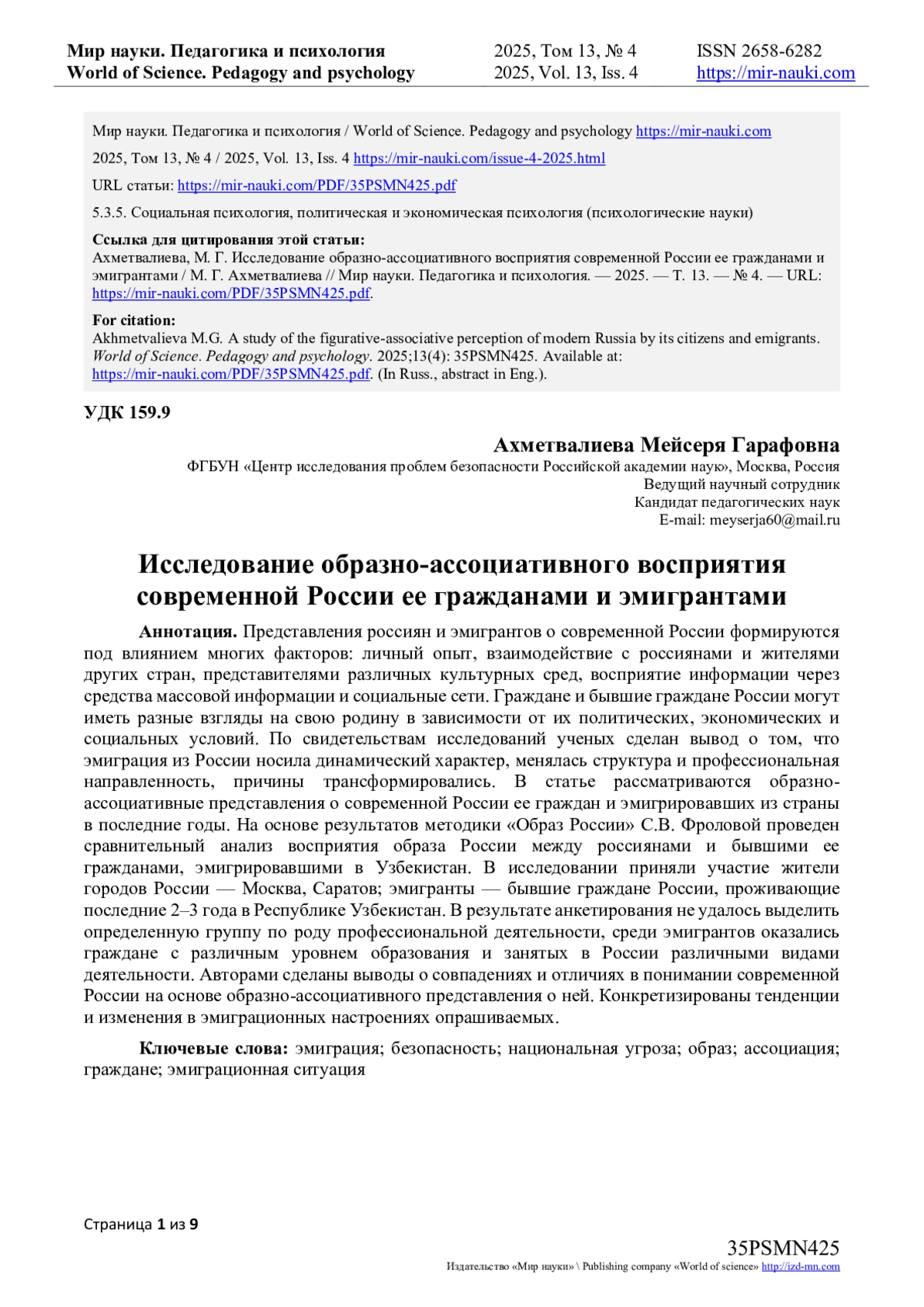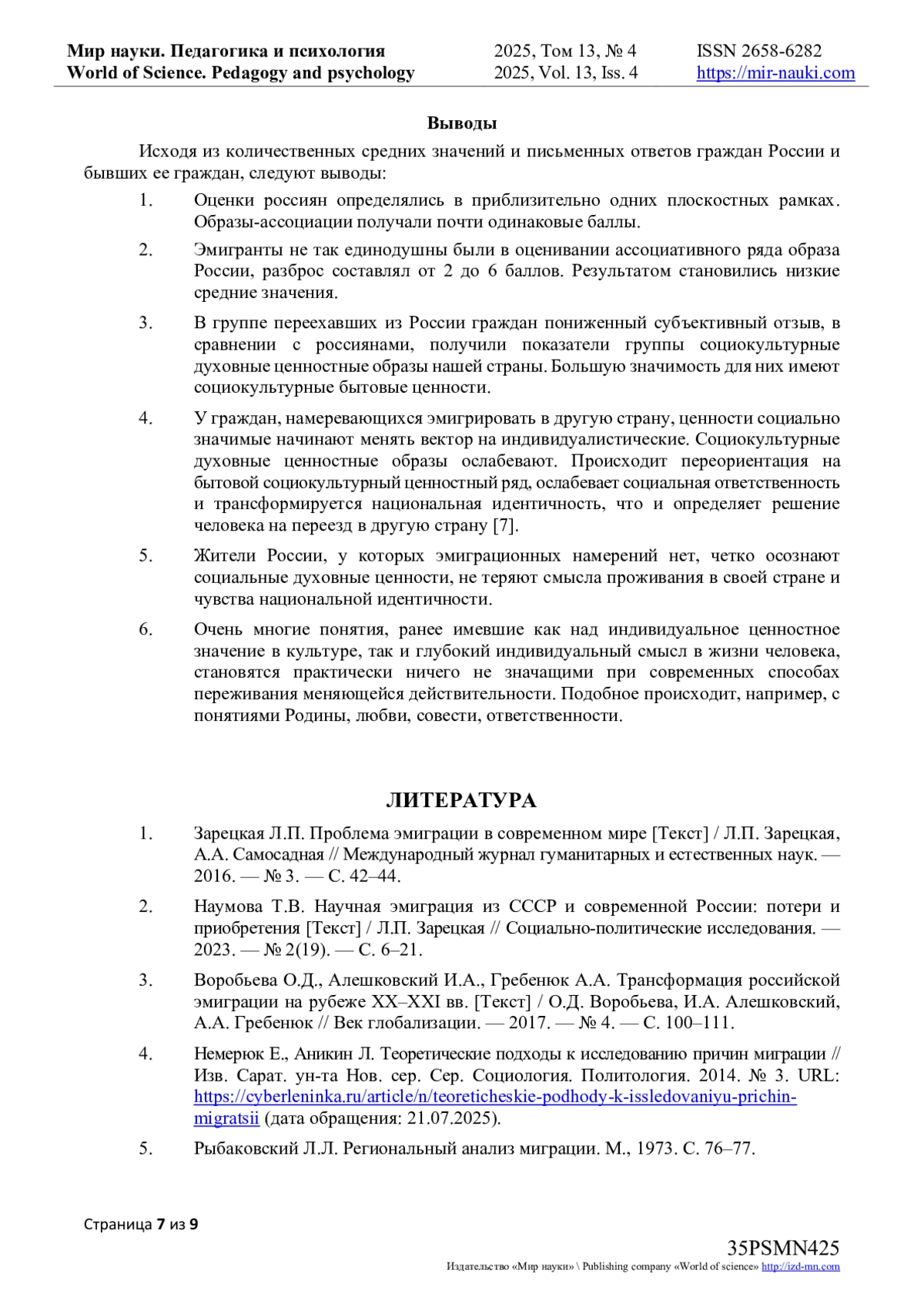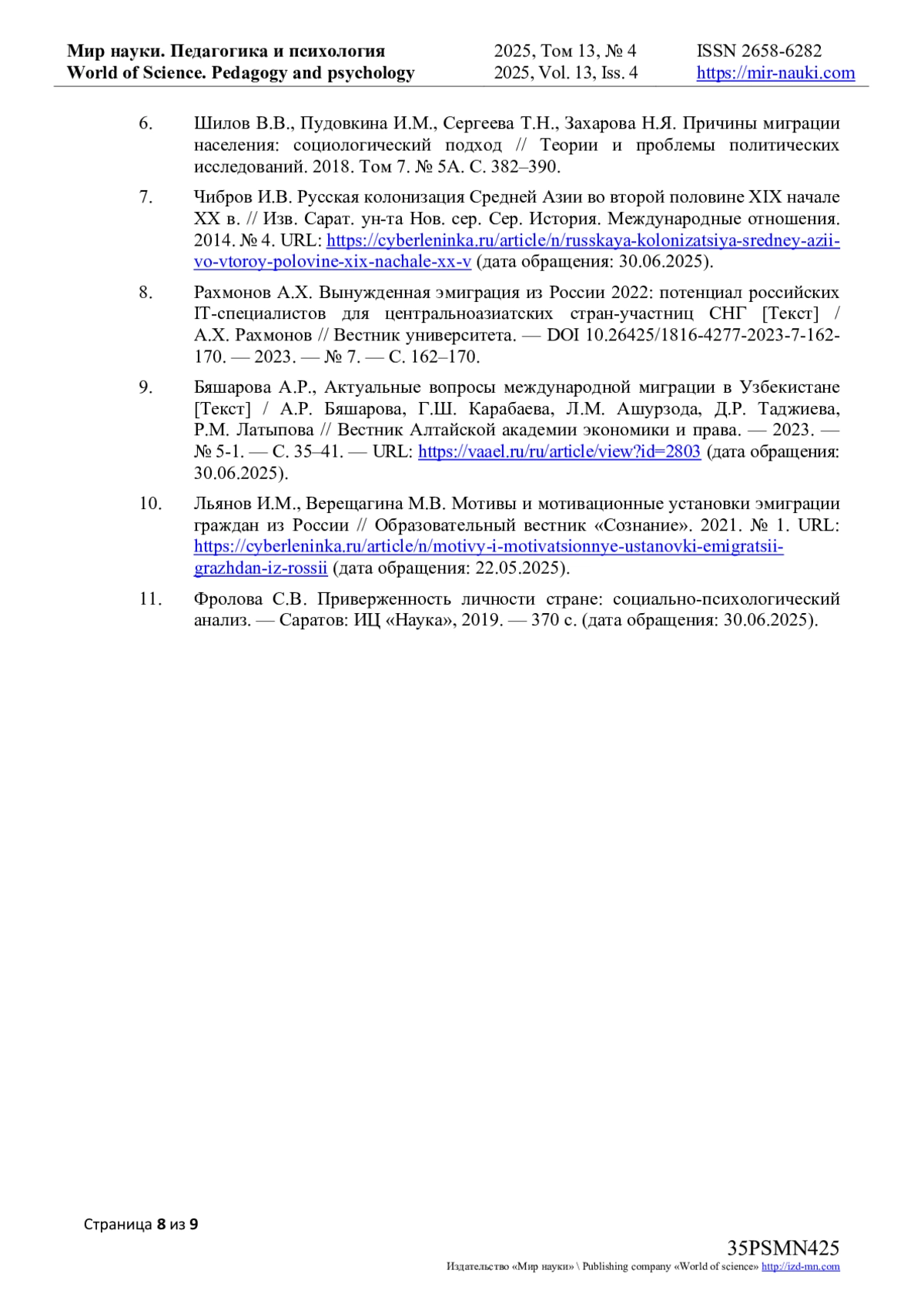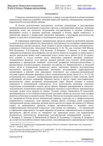 10. Льянов И.М., Верещагина М.В. Мотивы и мотивационные установки эмиграции граждан из России // Образовательный вестник “Сознание”. 2021. № 1. URL: https://cyberleninka.ru/article/n/motivy-i-motivatsionnye-ustanovki-emigratsii-grazhdan-iz-rossii (дата обращения: 22.05.2025). EDN: PIXNXE