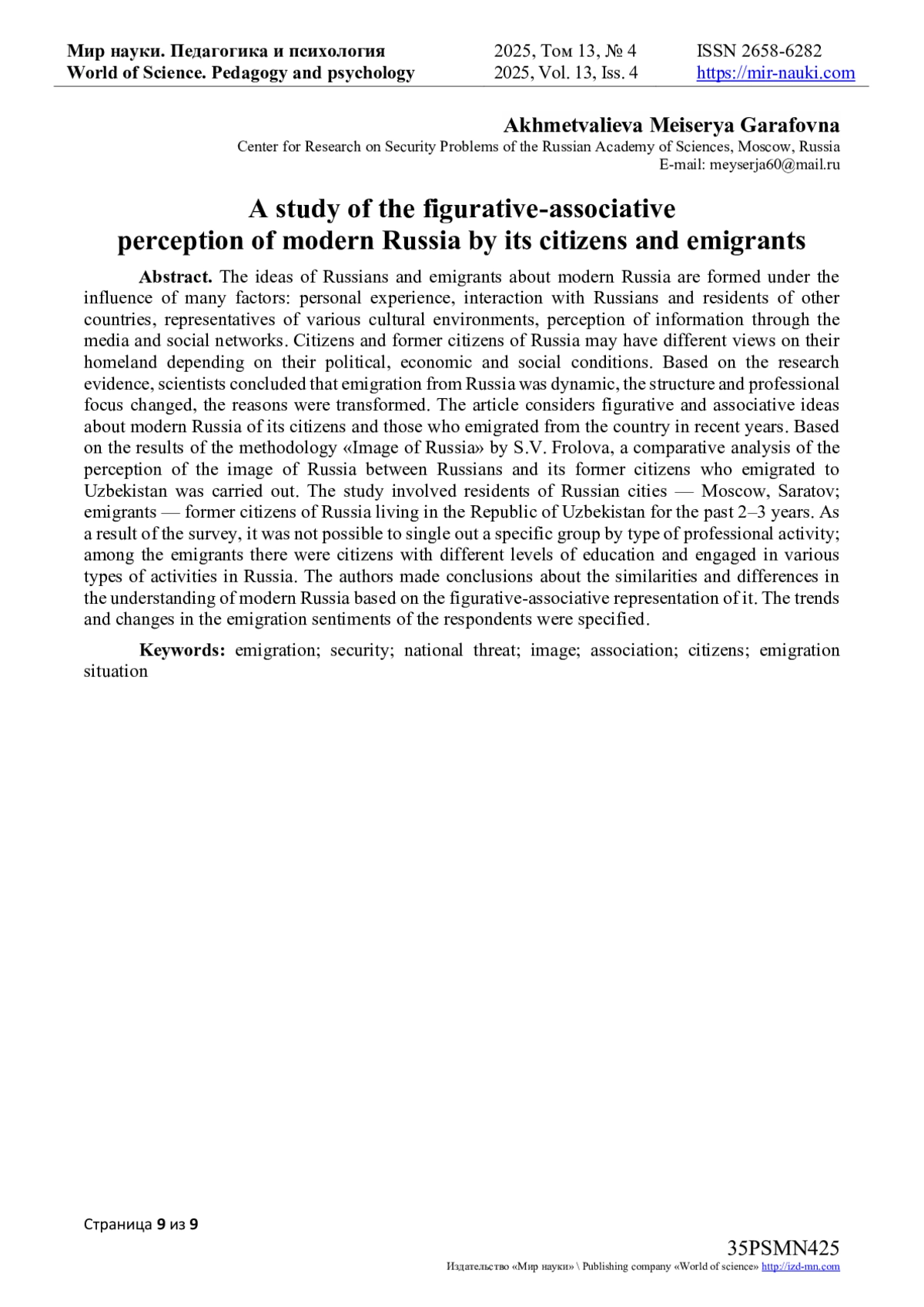 Представления россиян и эмигрантов о современной России формируются под влиянием многих факторов: личный опыт, взаимодействие с россиянами и жителями других стран, представителями различных культурных сред, восприятие информации через средства массовой информации и социальные сети. Граждане и бывшие граждане России могут иметь разные взгляды на свою родину в зависимости от их политических, экономических и социальных условий. По свидетельствам исследований ученых сделан вывод о том, что эмиграция из России носила динамический характер, менялась структура и профессиональная направленность, причины трансформировались. В статье рассматриваются образно-ассоциативные представления о современной России ее граждан и эмигрировавших из страны в последние годы. На основе результатов методики «Образ России» С. В. Фроловой проведен сравнительный анализ восприятия образа России между россиянами и бывшими ее гражданами, эмигрировавшими в Узбекистан. В исследовании приняли участие жители городов России - Москва, Саратов; эмигранты - бывшие граждане России, проживающие последние 2-3 года в Республике Узбекистан. В результате анкетирования не удалось выделить определенную группу по роду профессиональной деятельности, среди эмигрантов оказались граждане с различным уровнем образования и занятых в России различными видами деятельности. Авторами сделаны выводы о совпадениях и отличиях в понимании современной России на основе образно-ассоциативного представления о ней. Конкретизированы тенденции и изменения в эмиграционных настроениях опрашиваемых.