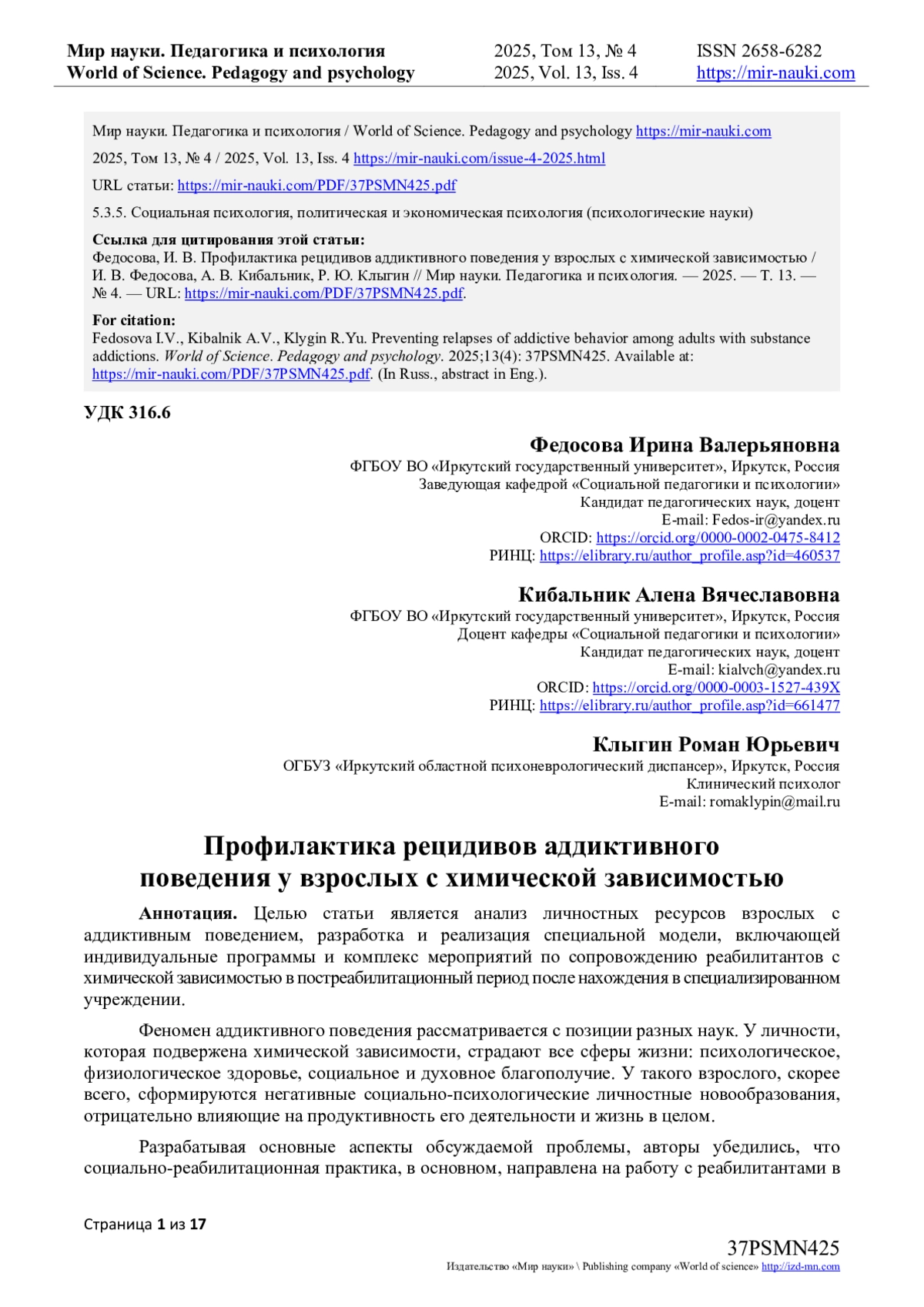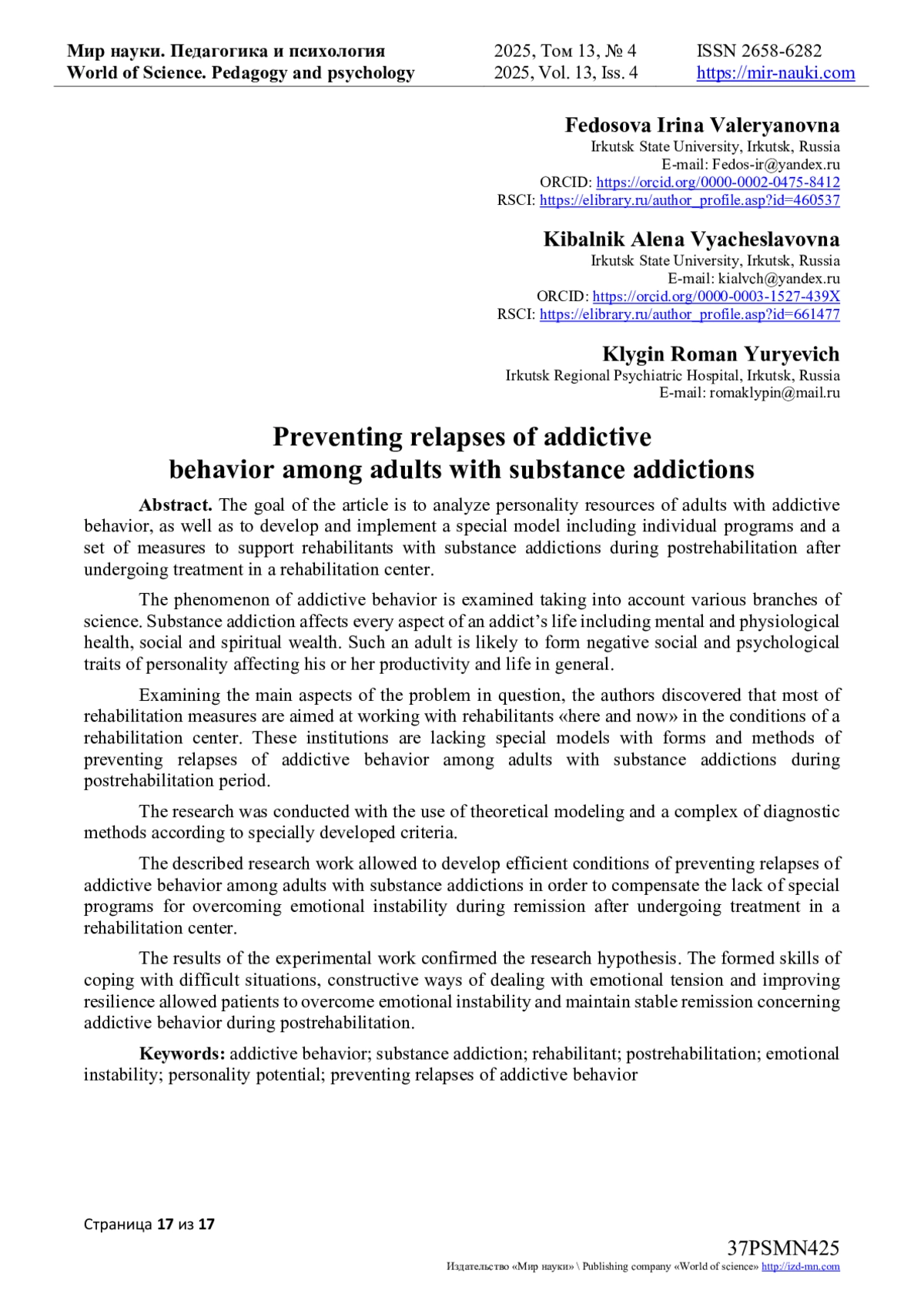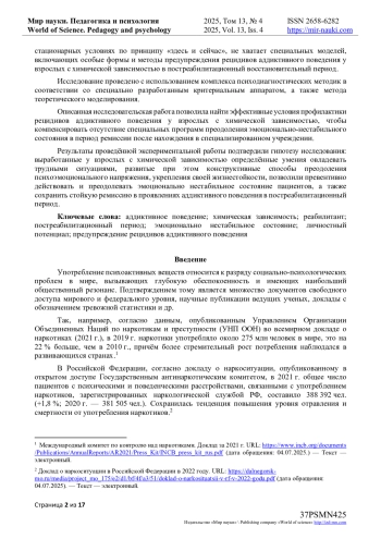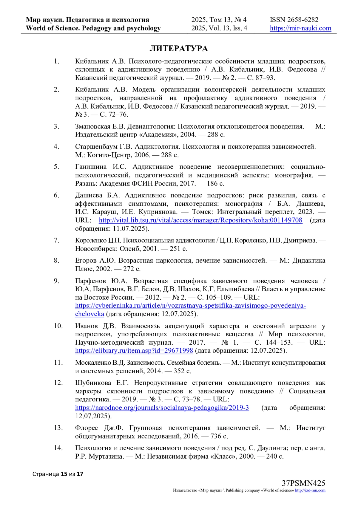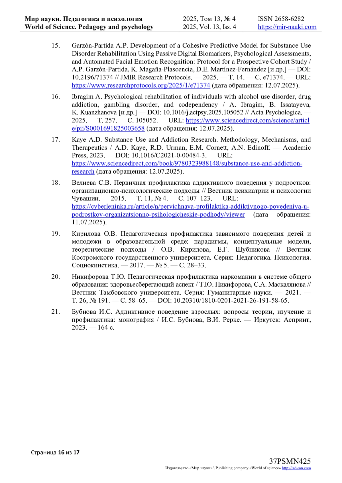16. Ibragim A. Psychological rehabilitation of individuals with alcohol use disorder, drug addiction, gambling disorder, and codependency / A. Ibragim, B. Issatayeva, K. Kuanzhanova [и др.] - // Acta Psychologica. - 2025. - Т. 257. - С. 105052. - URL: https://www.sciencedirect.com/science/article/pii/S0001691825003658 (дата обращения: 12.07.2025). DOI: 10.1016/j.actpsy.2025.105052 EDN: WMQJUF