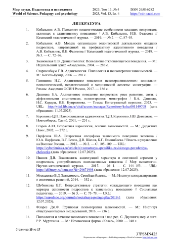 18. Велиева С.В. Первичная профилактика аддиктивного поведения у подростков: организационно-психологические подходы // Вестник психиатрии и психологии Чувашии. - 2015. - Т. 11, № 4. - С. 107-123. - URL: https://cyberleninka.ru/article/n/pervichnaya-profilaktika-addiktivnogo-povedeniya-u-podrostkov-organizatsionno-psihologicheskie-podhody/viewer (дата обращения: 11.07.2025). EDN: VUDEDD