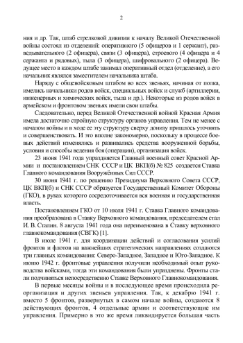 Созданные органы управления Красной Армии в межвоенный период 1921-1941 гг. почти не изменились до Великой Отечественной войны 1941-1945 гг. Во всех звеньях был положен принцип специализации отделов (исполнителей) по видам работ: оперативная, разведывательная, связи, шифровальная, учета и укомплектования личного состава, снабжения и др.