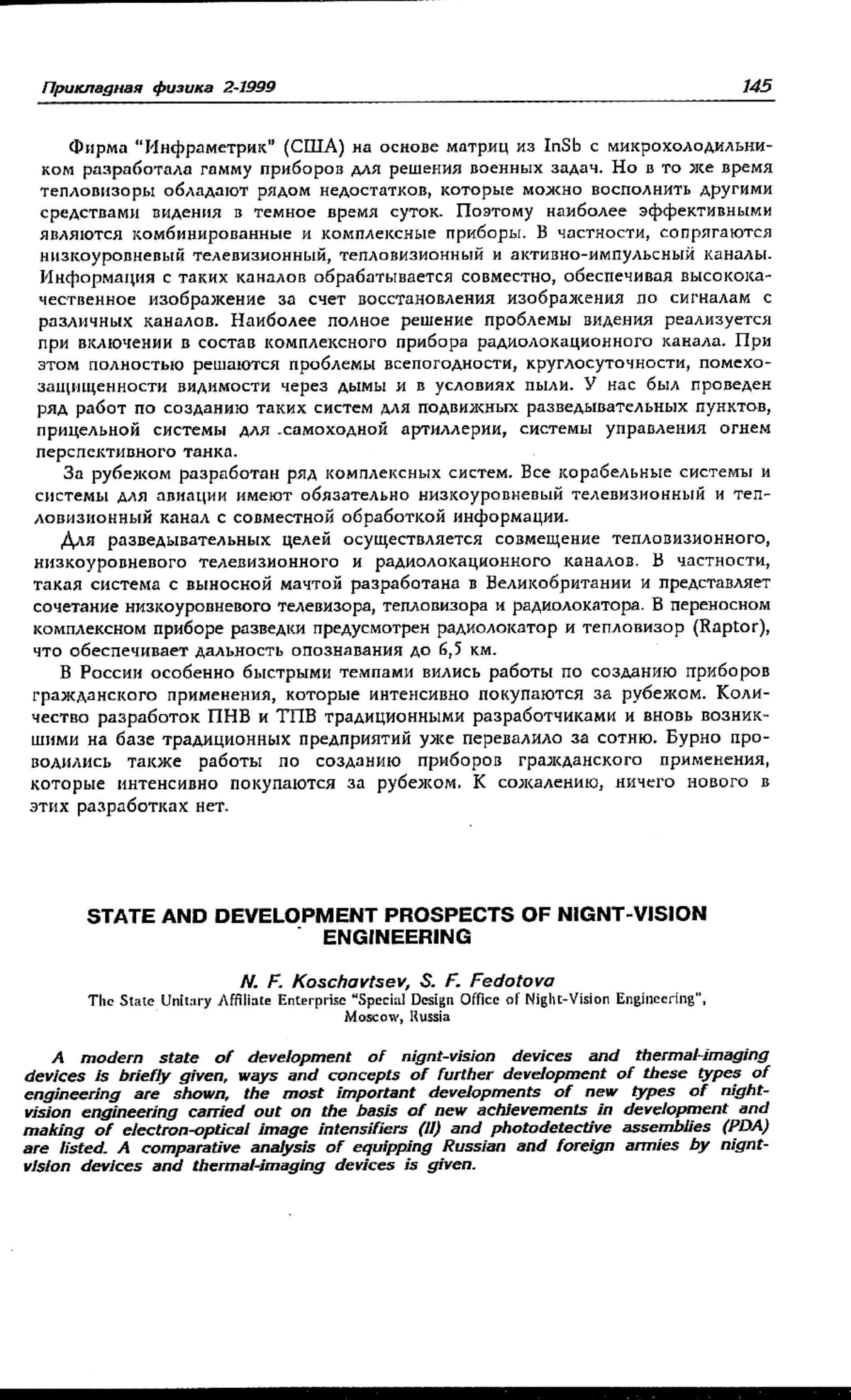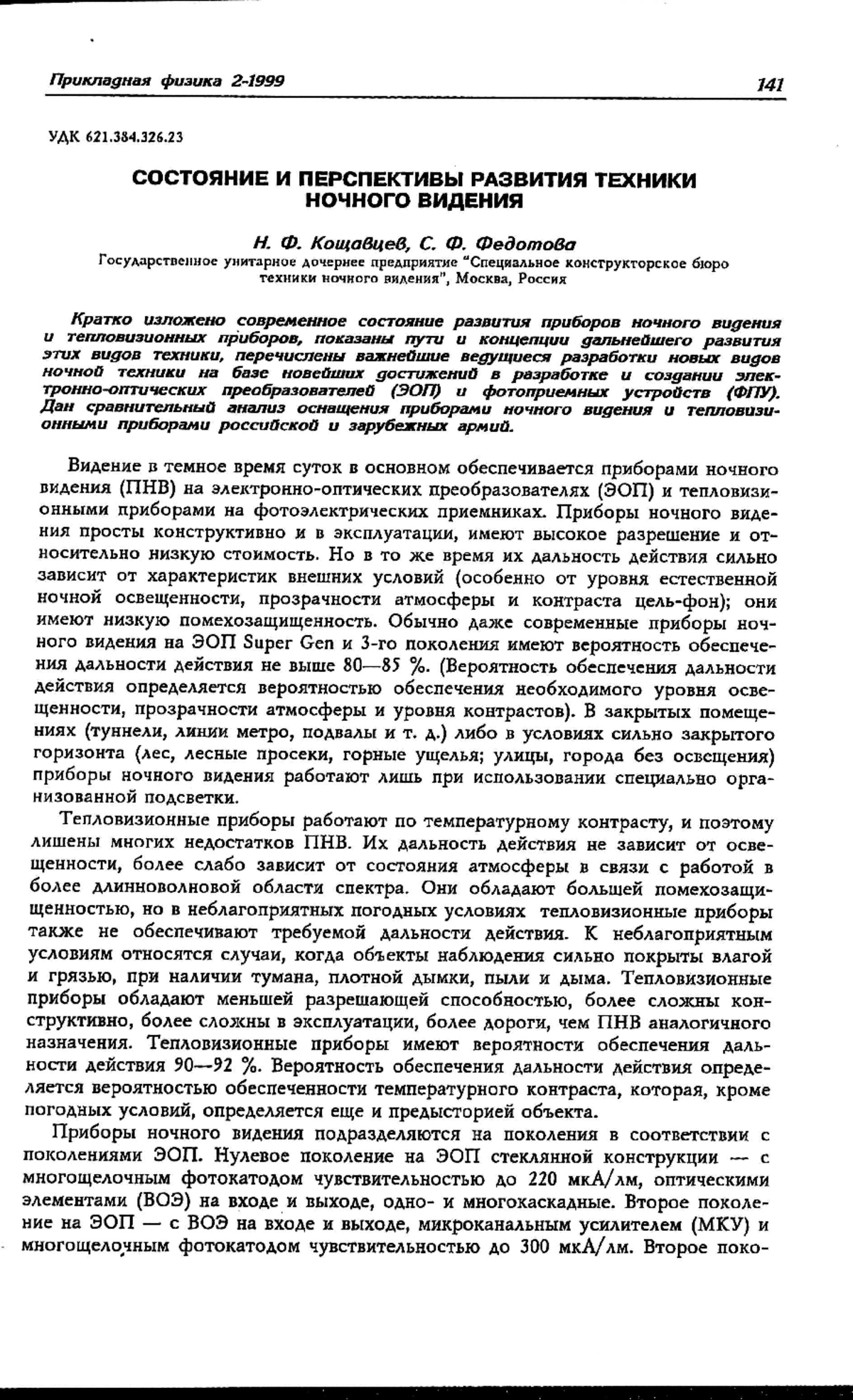 Кратко изложено современное состояние развития приборов ночного видения и тепловизионных приборов, показаны пути и концепции дальнейшего развития этих видов техники, перечислены важнейшие ведущиеся разработки новых видов ночной техники на базе новейших достижений в разработке и создании электронно- оптических преобразователей (ЭОП) и фотоприемных устройств (ФПУ). Дан сравнительный анализ оснащения приборами ночного видения и тепловизионными приборами российской и зарубежных армий.