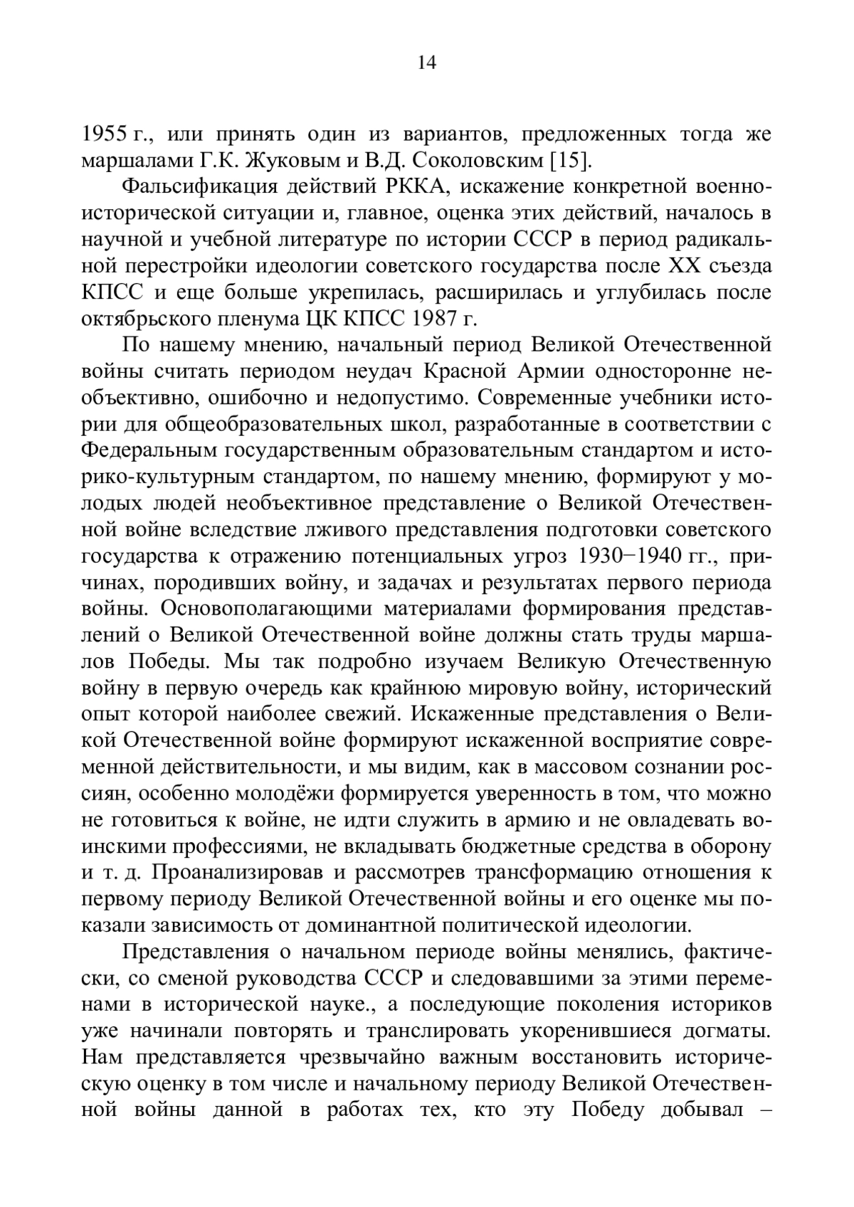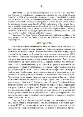 В статье рассматривается генезис причин Великой Отечественной войны, и её периодизация в учебной, научной и публицистической литературе с 1943 г. по 2024 г. Рассмотрены учебники по истории СССР с 1948 г. по 2024 г. Вскрыты противоречия между устоявшимися догматами учебно-научной литературы и точками зрения маршалов Победы, военного и политического руководства СССР на причины войны и характер боевых действий начального периода Великой Отечественной войны. Раскрыты фальсификации, имеющие место в исторической литературе и политическая ангажированность таких фальсификаций. Показана борьба с фальсификацией истории Великой Отечественной войны военных историков и военно-начальников.
