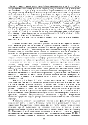Озимая пшеница – одна из важнейших, наиболее ценных и высокоурожайных зерновых культур. Целью исследований являлось определение параметров экологической пластичности и стабильности признака масса 1000 зерен у сортов и линий озимой мягкой пшеницы в условиях Республики Башкортостан. Объект исследований – 11 сортов и линий озимой мягкой пшеницы. Проведены исследования индекса условий среды, коэффициента экологической пластичности и стабильности, мультипликативности, адаптивности, а также устойчивости к стрессу и компенсаторной способности. По результатам исследований 2021-2024 гг. можно сделать вывод, что наиболее благоприятным для возделывания озимой мягкой пшеницы был 2022 г. (с индексом среды 1,40). Большей отзывчивостью (bi> 1) на улучшение условий среды обладали сортообразцы: Новоершовская, Сарра, Анастасия и Безенчукская 380 (bi = 1,33÷1,94). Наибольшей отзывчивостью в опыте отмечен сорт Новоершовская имеющий bi = 1,94. По результатам проведенных расчетов, наиболее пластичными являются сорта Новоершовская и Волжская К (К. А. = 103,06÷103,14%). Менее адаптивным оказался сорт Сарра (К. А. = 102,5%), слегка превысив стандарт. Сорта и линии: Безенчукская 380, У 214, Калач 60, Волжская К и А 312 (ИЭП = 1,07÷1,38) характеризуются как пластичные (по А. А. Грязнову). Высокие значения коэффициента мультипликативности отмечены у сортов озимой мягкой пшеницы: Московская 39, Безенчукская 380, Анастасия и Новоершовская (КМ = 2,01÷3,05). Высокой стрессоустойчивостью характеризуются сорта озимой мягкой пшеницы Калач 60, Башкирская 10 и линия У 214 (Ymin – Ymax = –1,0÷–2,5)