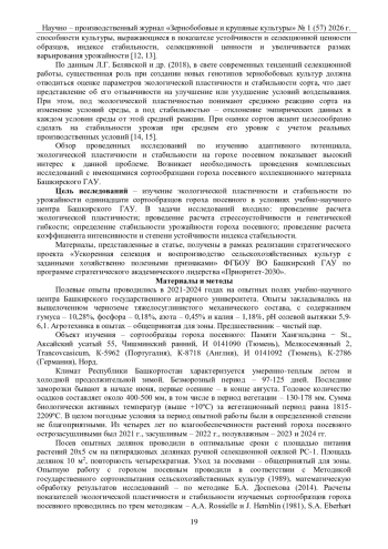 В ходе исследований изучены фенологические особенности развития растений, морфологические признаки, элементы структуры урожая и показатели продуктивности. Для оценки засухоустойчивости использован комплекс интегральных индексов (STI, GMP, HM, MP, TOL, SSI, K1SYI, K2SY), а также проведён корреляционный анализ взаимосвязей между урожайностью и индексами устойчивости в стрессовых и благоприятных условиях.