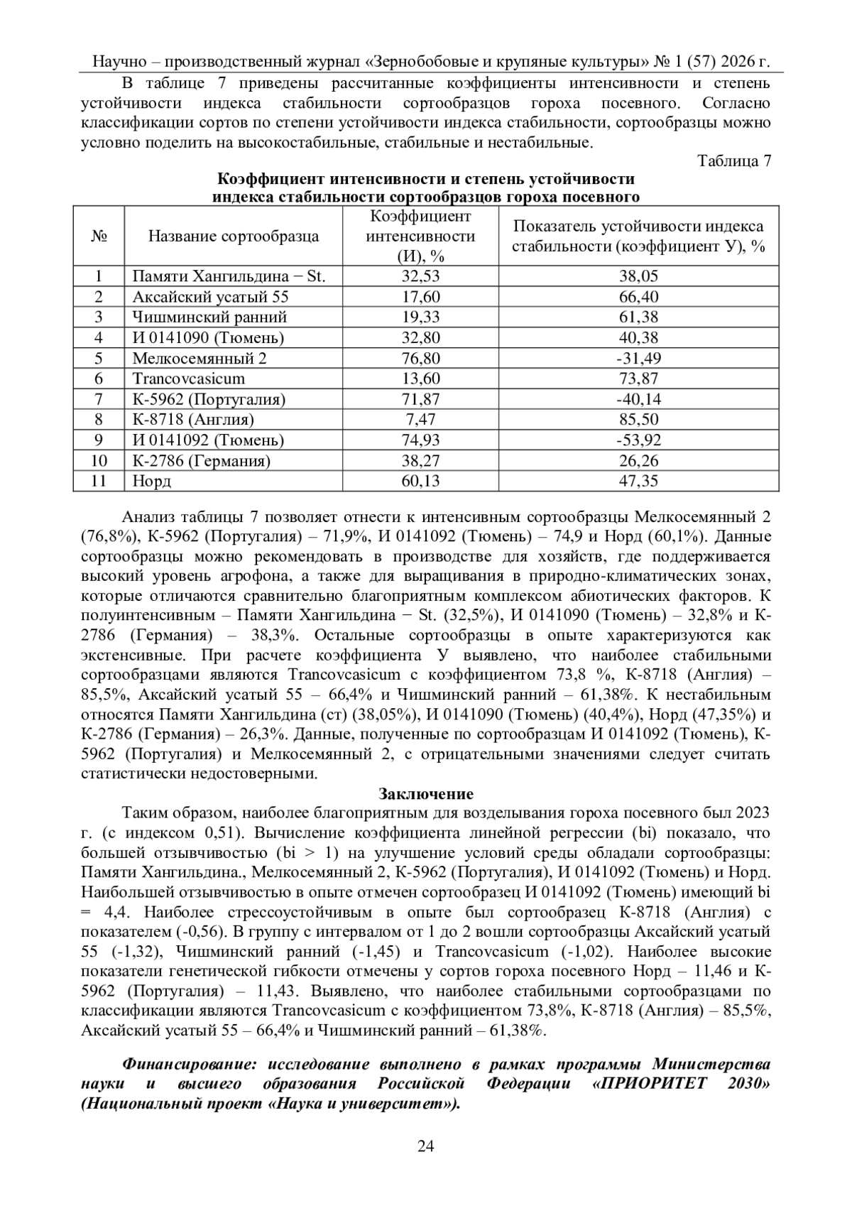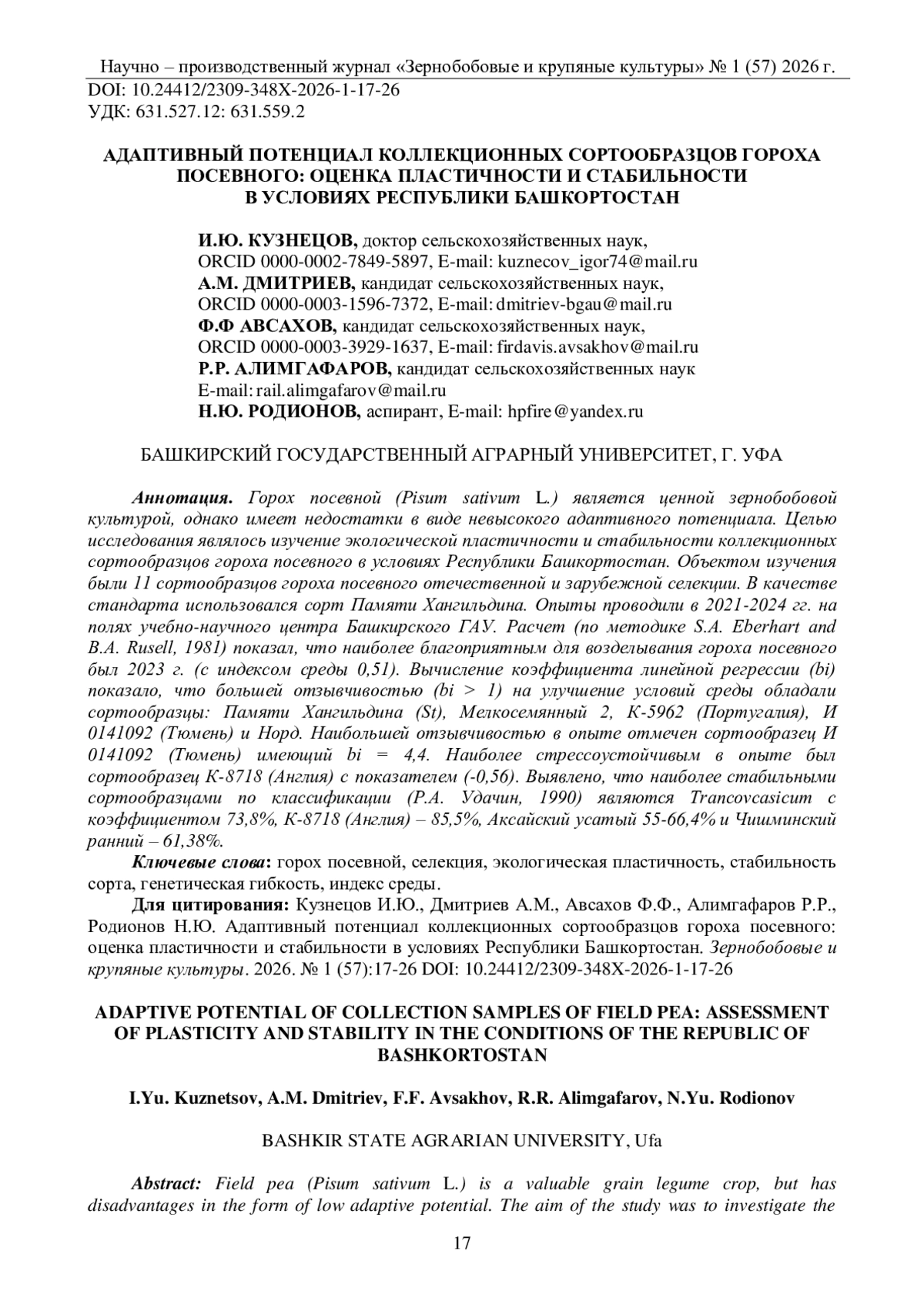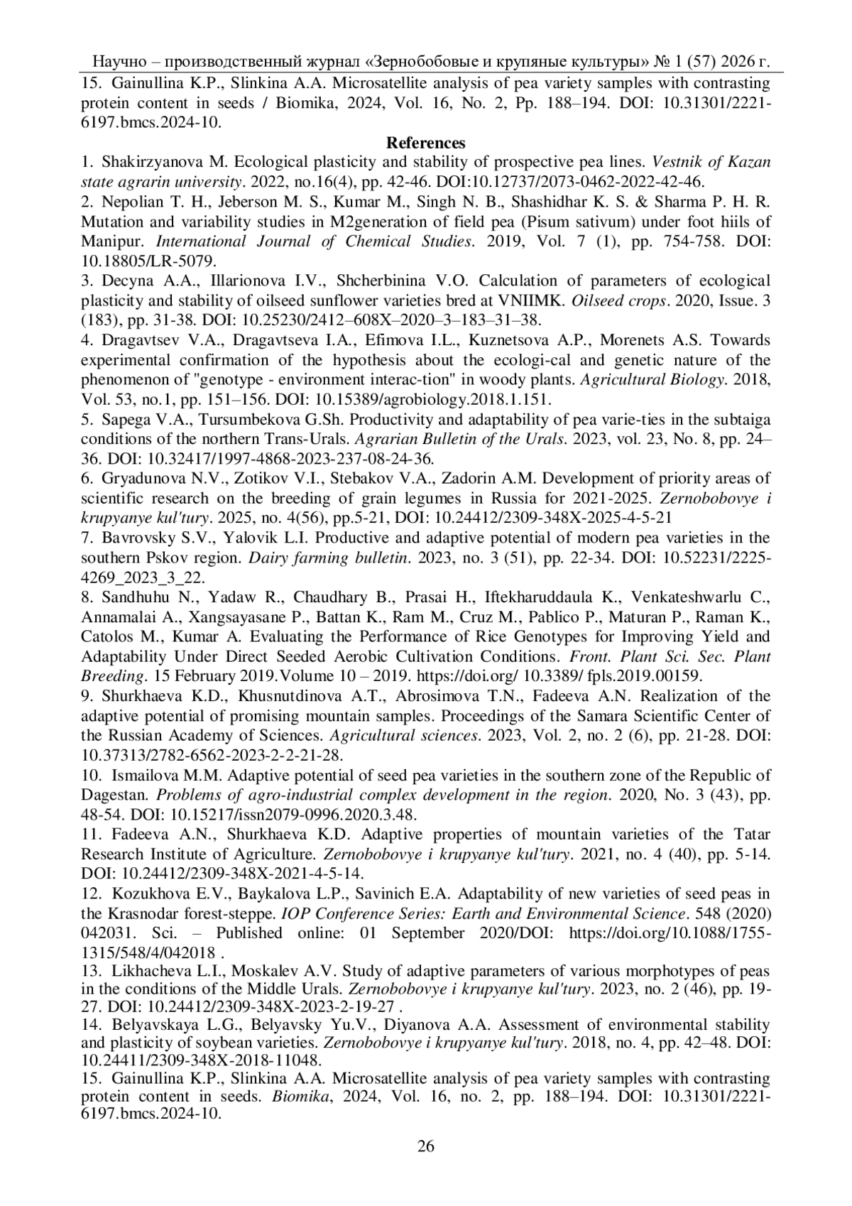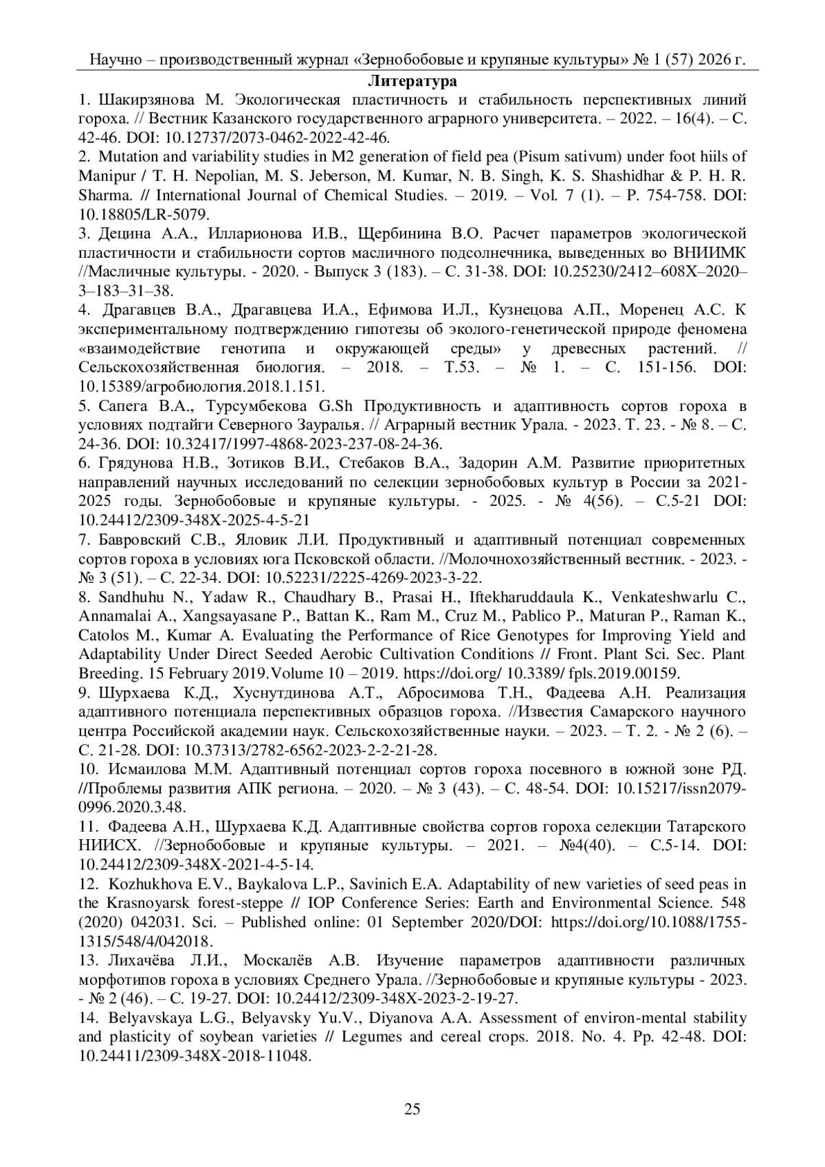 6. Грядунова Н.В., Зотиков В.И., Стебаков В.А., Задорин А.М. Развитие приоритетных направлений научных исследований по селекции зернобобовых культур в России за 2021-2025 годы. Зернобобовые и крупяные культуры. - 2025. - № 4(56). - С.5-21. DOI: 10.24412/2309-348X-2025-4-5-21