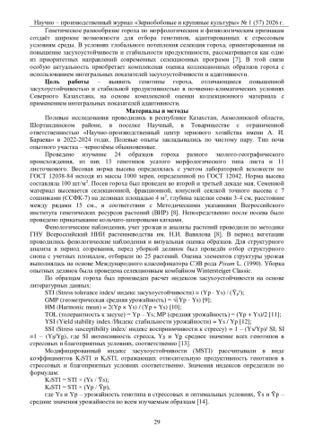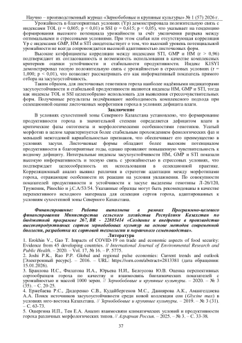 В ходе исследований изучены фенологические особенности развития растений, морфологические признаки, элементы структуры урожая и показатели продуктивности. Для оценки засухоустойчивости использован комплекс интегральных индексов (STI, GMP, HM, MP, TOL, SSI, K1SYI, K2SY), а также проведён корреляционный анализ взаимосвязей между урожайностью и индексами устойчивости в стрессовых и благоприятных условиях.