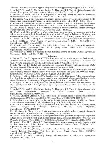 11. Wen P., et al. Field identification of drought tolerant wheat genotypes using canopy vegetation indices instead of plant physiological and biochemical traits, Ecological Indicators. Physiology and Molecular Biology of Plants. 2023. - 154: 110781. DOI: 10.1016/j.ecolind.2023.110781 EDN: BUGAMQ