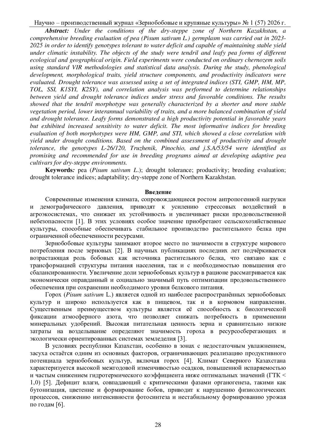 В условиях сухостепной зоны Северного Казахстана в 2023-2025 гг. проведена комплексная селекционная оценка коллекционных образцов гороха (Pisum sativum L.) различных морфологических типов с целью выявления генотипов, устойчивых к дефициту влаги и способных обеспечивать стабильную урожайность в условиях климатической нестабильности. Объектом исследований служили усатые и листочковые формы гороха различного эколого-географического происхождения. Опыты заложены на чернозёмах обыкновенных с применением общепринятых методик ВИР и статистической обработки данных.