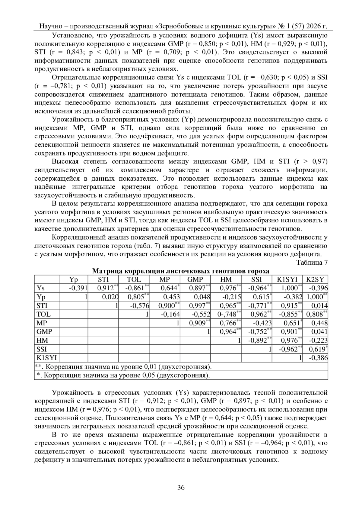 Установлено, что усатый морфотип в среднем характеризуется более укороченным и стабильным вегетационным периодом, меньшей межгодовой вариабельностью признаков и более сбалансированным сочетанием урожайности и засухоустойчивости. Листочковые формы обладают высоким потенциалом продуктивности в благоприятные годы, однако проявляют повышенную чувствительность к водному дефициту. Наиболее информативными показателями при селекционной оценке обоих морфотипов являются индексы HM, GMP и STI, тесно коррелирующие с урожайностью в стрессовых условиях. По совокупности признаков выделены перспективные генотипы Л-26/120, Труженик, Pinochio и j. С. А/53/54, рекомендованные для использования в селекционных программах, направленных на создание адаптивных сортов гороха для условий сухостепной зоны.