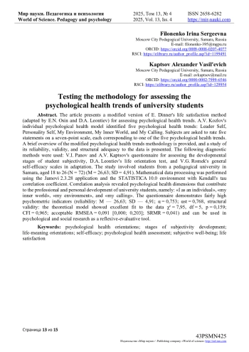 В статье представлен модифицированный вариант методики удовлетворенности жизнью Э. Диннера (адаптация Е. Н. Осина и Д. А. Леонтьева) - оценка направленностей психологического здоровья. Апробация индивидуальной модели психологического здоровья А. В. Козлова определила пять направленностей психологического здоровья: Я-лидер, Я-личность, мое окружение, мой внутренний мир, мое призвание. Испытуемому предлагается оценить по семибалльной шкале пять утверждений, каждое из которых соответствует одной из пяти направленностей психологического здоровья. Дан краткий обзор модифицированной методики направленностей психологического здоровья, представлено исследование методики на проверку надежности, валидности и соответствие структуры данным. В качестве диагностических методов использовались: опросник оценки сформированности стадий становления субъектности студентов В. И. Панова и А. В. Капцова, тест смысложизненных ориентаций Д. А. Леонтьева и шкалы общей самоэффективности в адаптации В. Г. Ромек. В исследовании участвовали студенты педагогического вуза города Самары от 18 до 26 лет (N = 72) (М = 26,63; Sd = 4,91). Математическая обработка данных проводилась в приложении Jamovi 2.3.28 и среде STATISTICA 10.0 с коэффициентом корреляции тау Кендалла. Корреляционный анализ показал направленности психологического здоровья, которые способствуют профессиональному и личностному развитию обучающегося вуза, а именно: «Я-личность», «мой внутренний мир», «моё окружение» и «моё призвание». Опросник демонстрирует достаточно высокие психометрические показатели (надежность: М - 26,63; SD - 4,91; α = 0,753; αst = 0,768, структурная валидность: теоретическая модель показала отличное соответствие данным χ² = 7,95, df = 5, р = 0,159; CFI = 0,965; приемлемую RMSEA = 0,091 [0,000; 0,203]; SRMR = 0,041) и может быть использован в психологических и социальных исследованиях в качестве рефлексивно-оценочного инструмента.