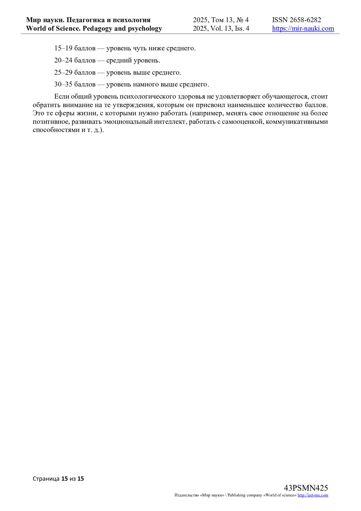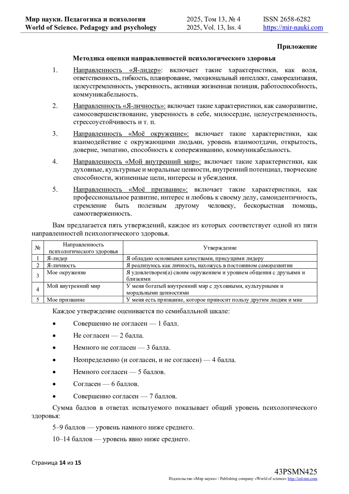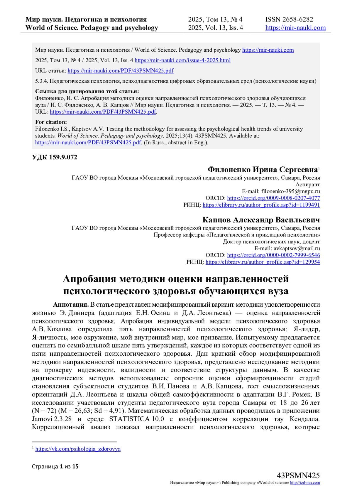 18. Козлов А.В. Структура психологического здоровья: психосемантический подход / А.В. Козлов // Вестник Харьковского национального университета - 2011. - Серия: Психология. - № 937. - С. 130-133. - URL: https://pnojournal.wordpress.com/wp-content/uploads/2014/07/pdf_140617.pdf (дата обращения: 10.05.2025).