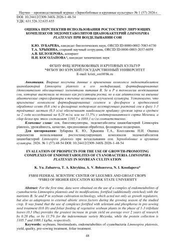 Впервые получены данные о применении комплекса эндометаболитов цианобактерий Limnospira platensis и его модификаций, фортифицированных (дополнительно обогащенные) элементами питания B, Se и Р в технологии возделывания сои, которые выступили не только как регуляторы роста, но и как адаптогены на внешние абиотические стрессфакторы в течение вегетации изучаемой культуры. Установлено, что применение комплексов фортифицированных селеном и фосфором в предпосевной обработке семян (0,6 л/т) и фолиарных подкормках вегетирующих растений сои в фазу 1-3 тройчатых листьев (0,3 л/га) обеспечивает наибольшую прибавку урожая зерна в среднем за 2 года исследований на 0,28 т/га, или на 11,5% у индетерминантного сорта Мезенка, а сбор белка при этом составляет 1105,7 и 1088,1 кг/га соответственно.